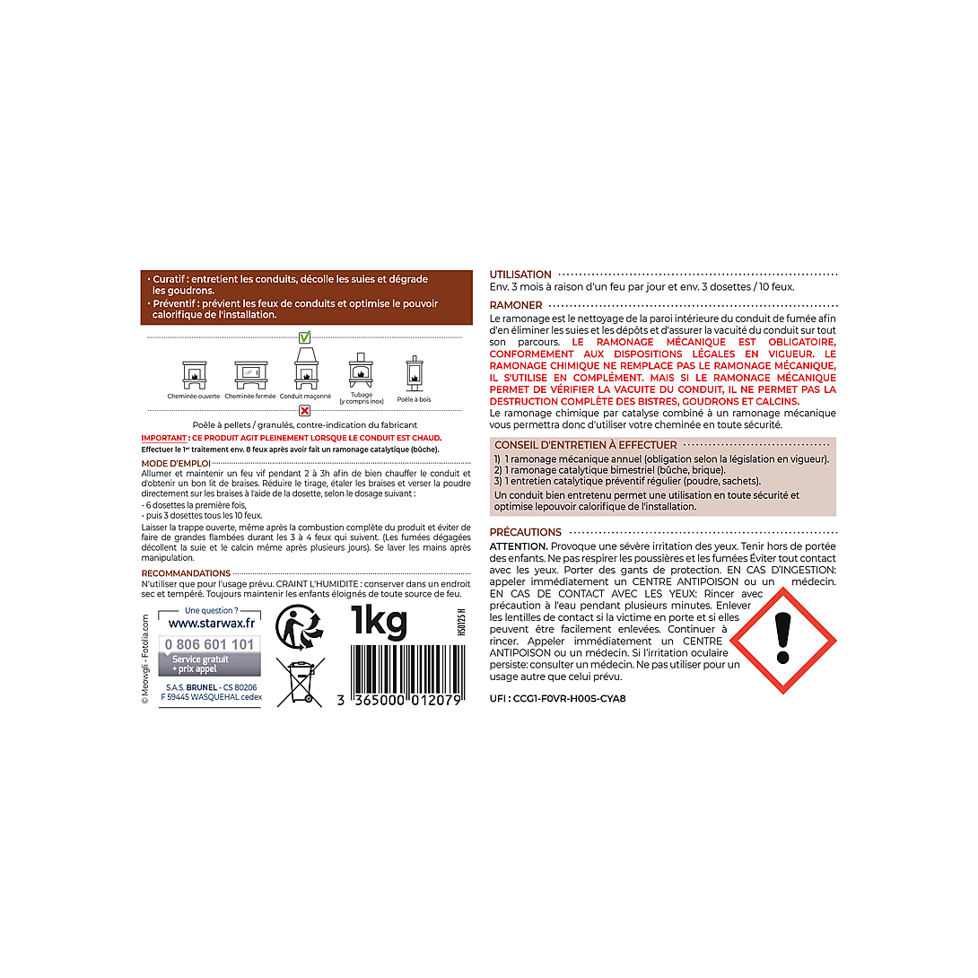 La poudre de ramonage pour poêle et cheminée s'utilise en curatif pour décoller les suies et goudrons et en préventif pour prévenir les feux de cheminée et optimiser le pouvoir calorifique de votre installation. Vous pouvez utiliser cette poudre de ramonage avec tout type de cheminée ou poêle, sauf contre-indications du fabricant, Bien que le ramonage chimique assure la vacuité du conduit sur tout son parcours, il ne permet pas la destruction complète des goudrons, suies, bistres. Le ramonage chimique ne remplace pas le ramonage mécanique, il s'utilise en complément, Le ramonage mécanique reste obligatoire, conformément aux dispositions en vigueur. Nous vous conseillons donc de procéder en plus du ramonage mécanique annuel (obligation légale) à un ramonage catalytique bimestriel (bûche ou brique) et à un entretien catalytique régulier grâce aux poudres et sachets, Dosage adaptable selon le nombre de feux. Curatif : entretient les conduits, décolle les suies et dégrade les goudrons. Préventif : prévient les feux de conduits et restitue le pouvoir calorifique. Ne convient pas pour les poêles à granulés/pellets.
