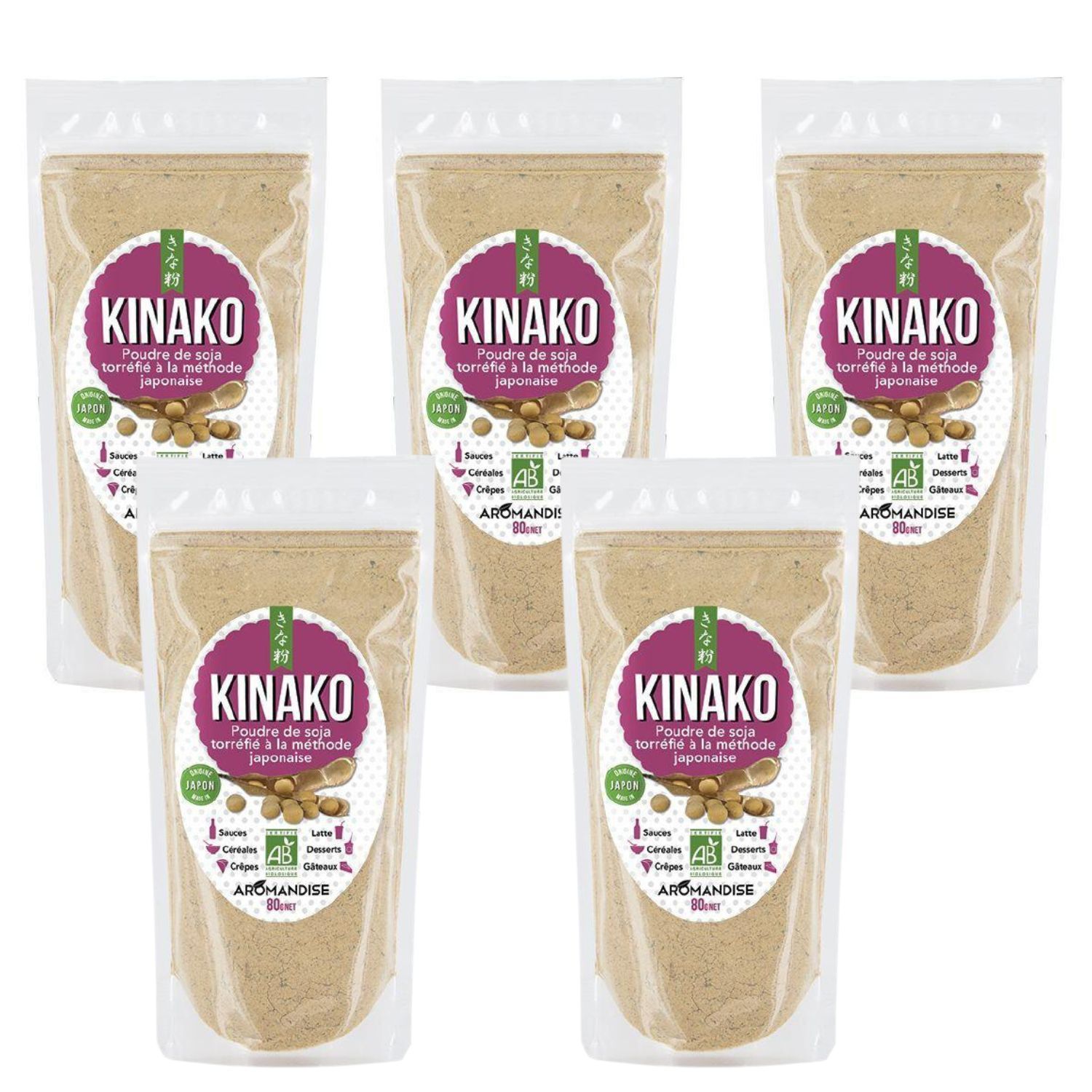 Soja bio Kinako 5 sachets de 200 g. Le Kinako, c'est un condiment traditionnel japonais uniquement à base de soja torréfié ! Utilisé pour donner un délicieux goût de cacahuète - noisette grillées au gâteaux mochis de riz, il offre une très large palette d'utilisation pour toutes sortes de plats et de desserts. Très facile à utiliser, il se saupoudre et s'intègre sans effort sur ou dans vos préparations. Idéal comme substitut au sucre, il deviendra un incontournable dans votre cuisine !