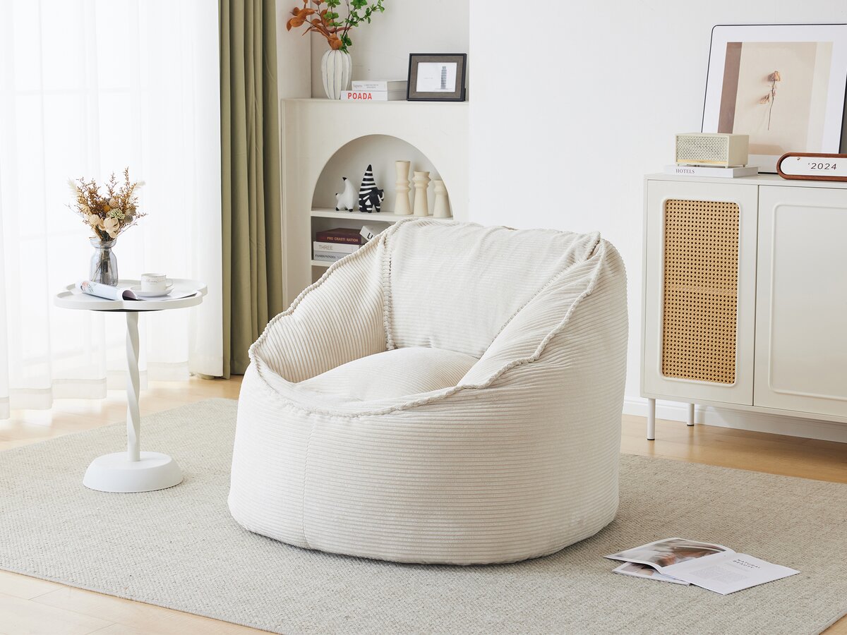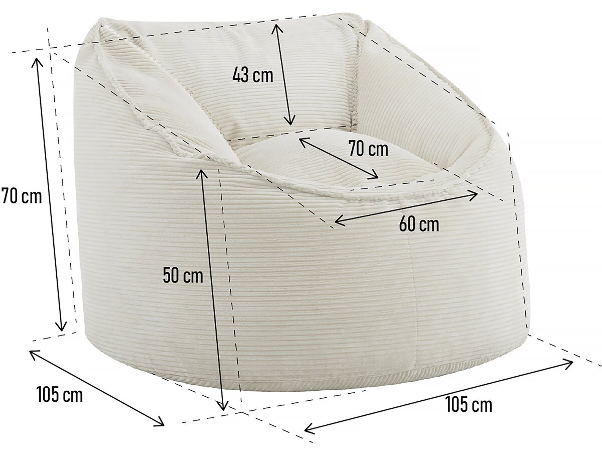 Couleur:Beige.Matière:Velours côtelé.Forme:Ronde.Structure:Remplissage de billes de polystyrène et flocons de mousse.Densité:Densité du velours 345 g/m2 Densité de la mousse : 28D.Dimensions:105 x 105 x 70 cm.Hauteur d'assise:50 cm.Profondeur assise:70 cm.Déhoussable:Non.Tissu anti bouloches:Oui.Type de confort assise:Ultra moelleux.Entretien:Utilisez régulièrement un aspirateur muni d'une brosse douce pour enlever la poussière et les particules de saleté. Cela évitera que la saleté ne s'accumule dans les fibres du velours.le + produit:Le mélange de billes de polystyrène et de flocons de mousse enveloppe votre corps dans un cocon de douceur et de bien-être Tissu doux et tendance Livré prêt a installer .Poids:10,5 kg.Colisage:1 colis : - 1,065 x 1,065 x 0,66 m, 24,5 kg.
