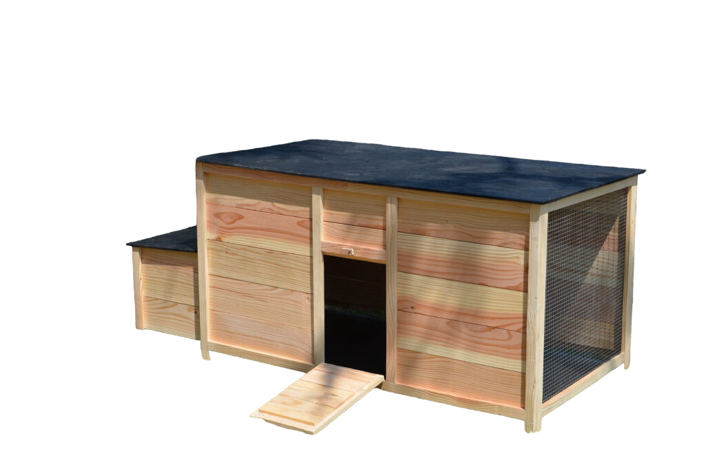 Poulailler en douglas avec habitat et pondoir 174,5x78x76 cm pour 3 à 5 poules. Le poulailler est composé d'un habitat avec une paroi en grillage galvanisé 13mm, d'un pondoir et d'une porte en lames douglas rabotées 1,2x14 cm, une structure en tasseaux de 2x4 cm et de 2 toits amovibles en OSB 3 recouvert de toile bitumée noire pour une étanchéité de qualité, qui ne laissera pas passer une goutte d’eau. Avec un habitat isolé du sol, vos poules seront à l’abri de l’humidité et du froid, et un accès au pondoir pour y laisser leurs œufs. Le pondoir à un accès extérieur avec un toit amovible pour y récolter vos œufs. Une aération est prévue sur un côté pour laisser circuler l’air et éviter les montées de vapeur d’ammoniaque dû à la fermentation des fientes. Les toits de l’habitat et du pondoir sont amovibles pour faciliter le nettoyage. Une porte de côté large et haute pour faciliter l’accès à l’intérieur.