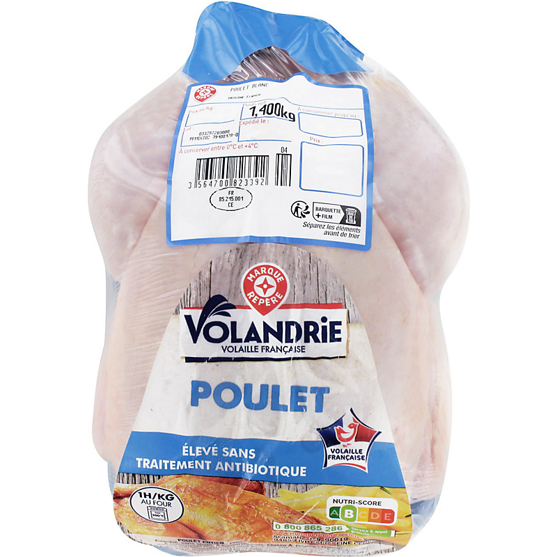 Poulet éviscéré sans abats, classe A, produit frais VOLANDRIE