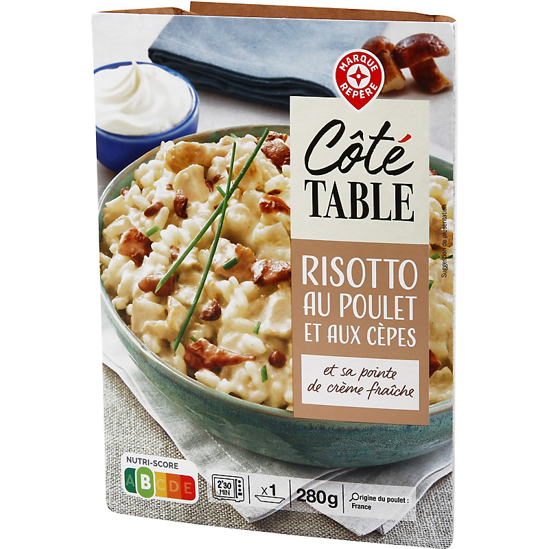 Ingrédients : Eau ; riz 16 % ; morceaux de viande de poulet traité en salaison cuit rôti 14,2 % (viande de poulet 12,5 %, eau, fécule de manioc, dextrose, sel) ; crème fraîche 11,6 % ; cèpes 3,8 % ; fromages râpés 3,6 % ; champignons de Paris 2,6 % ; oignon ; vin blanc 2,6 % ; amidon de maïs ; purée d'ail ; sel ; ciboulette ; poivre.