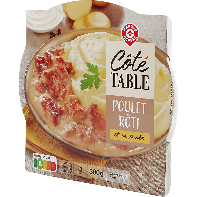 Ingrédients: Purée de pommes de terre 63 % (pommes de terre 44 % ; eau ; beurre ; crème 0,7 % ; sel ; muscade ; curcuma ; conservateur : disulfite de sodium) ; viande de poulet traitée en salaison et rôtie 25 % (viande de poulet ; eau ; stabilisant : E331 ; sel ; caramel [sucre, eau]) ; eau ; crème 1,4 % ; amidon de maïs ; oignon déshydraté ; arôme naturel ; ail ; caramel (sucre, eau) ; oignon en poudre ; thym ; poivre.