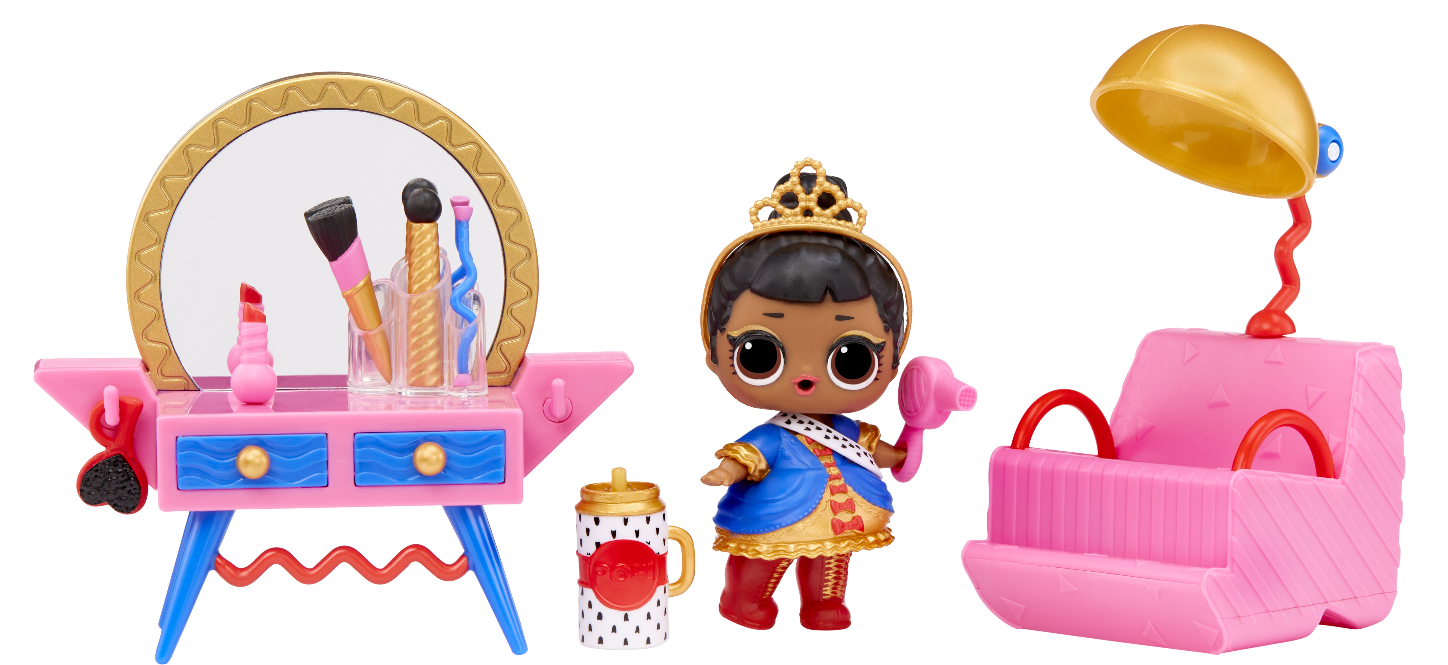 Découvrez Sa Majesté, 1 poupée préférée des fans qui est très glamour. Prête à ajouter une coiffeuse dans votre maison de poupée LOL Surprise OMG Maison des surprises ? La coiffeuse s'intègre parfaitement dans le spa afin que tous les poupées se maquillent avec style. Contient : 1 poupée exclusive, 1 coiffeuse, 1 chaise de salon, 1 sèche-cheveux, des pinceaux, du maquillage, 1 socle de rangement, 1 tenue, 1 diadème, 1 brosse, 1 bouteille.