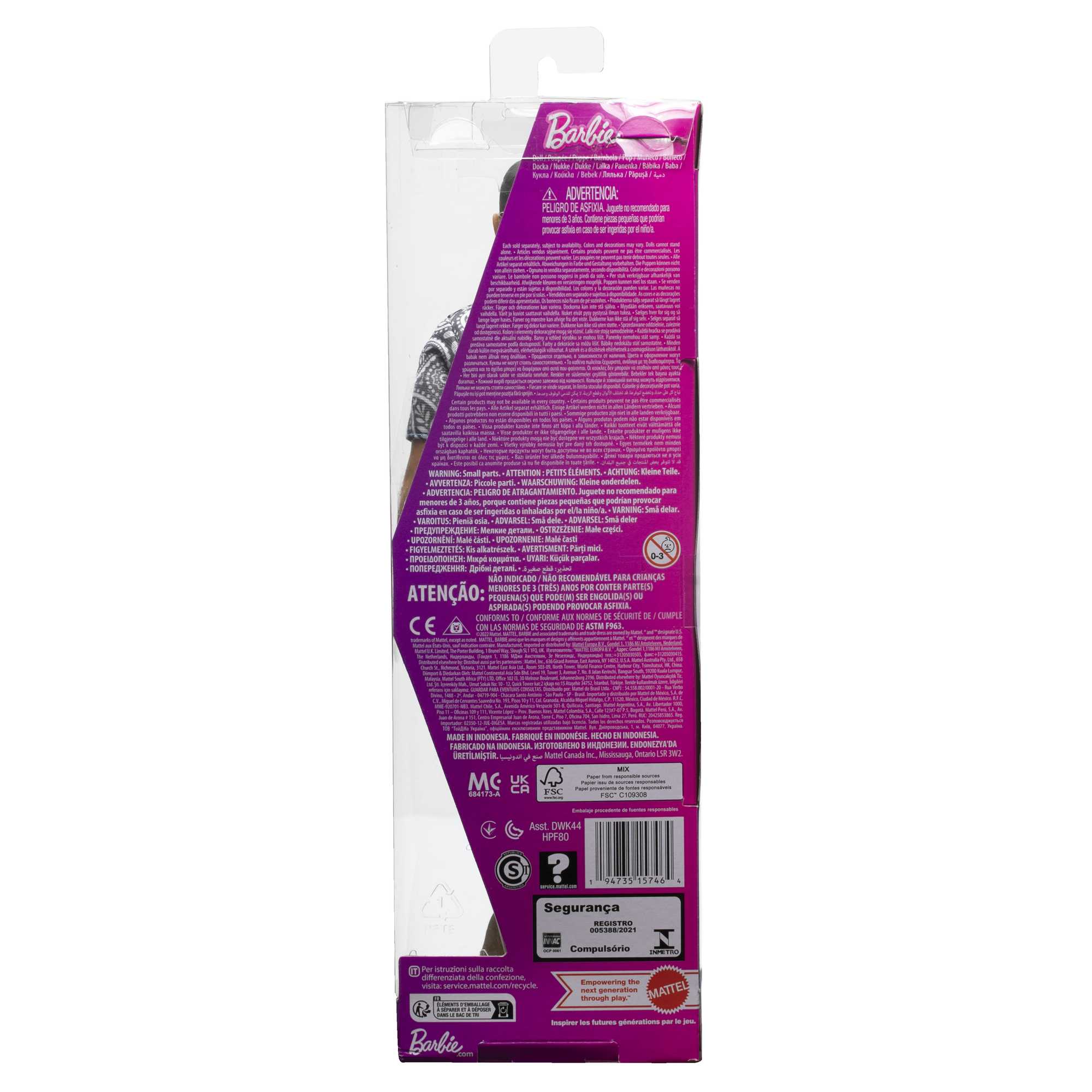 | Plus produit | Les poupées Ken® Fashionistas arborent un aspect cool, avec des tenues tendance adaptées à leur style personnel.\nCette poupée Ken® a une silhouette large et des cheveux bruns coiffés en chignon. Son t-shirt gris et son short bleu turquoise arborent un motif cachemire pour un look assorti !\nSes baskets jaune brillant ajoutent une touche colorée inattendue à sa tenue !\nConçu avec une fermeture zippée, le sac en vinyle réutilisable peut contenir une poupée ou des vêtements et accessoires Barbie®. Les enfants peuvent lutiliser pour jouer en déplacement et le décorer avec leurs propres fournitures artistiques, comme des autocollants ! \nAvec plus de variété, la collection de poupées Barbie® et Ken® Fashionistas est encore plus amusante : elles constituent le cadeau idéal pour les enfants à partir de 3 ans ! (Articles vendus séparément. Certains produits peuvent ne pas être commercialisés.) |