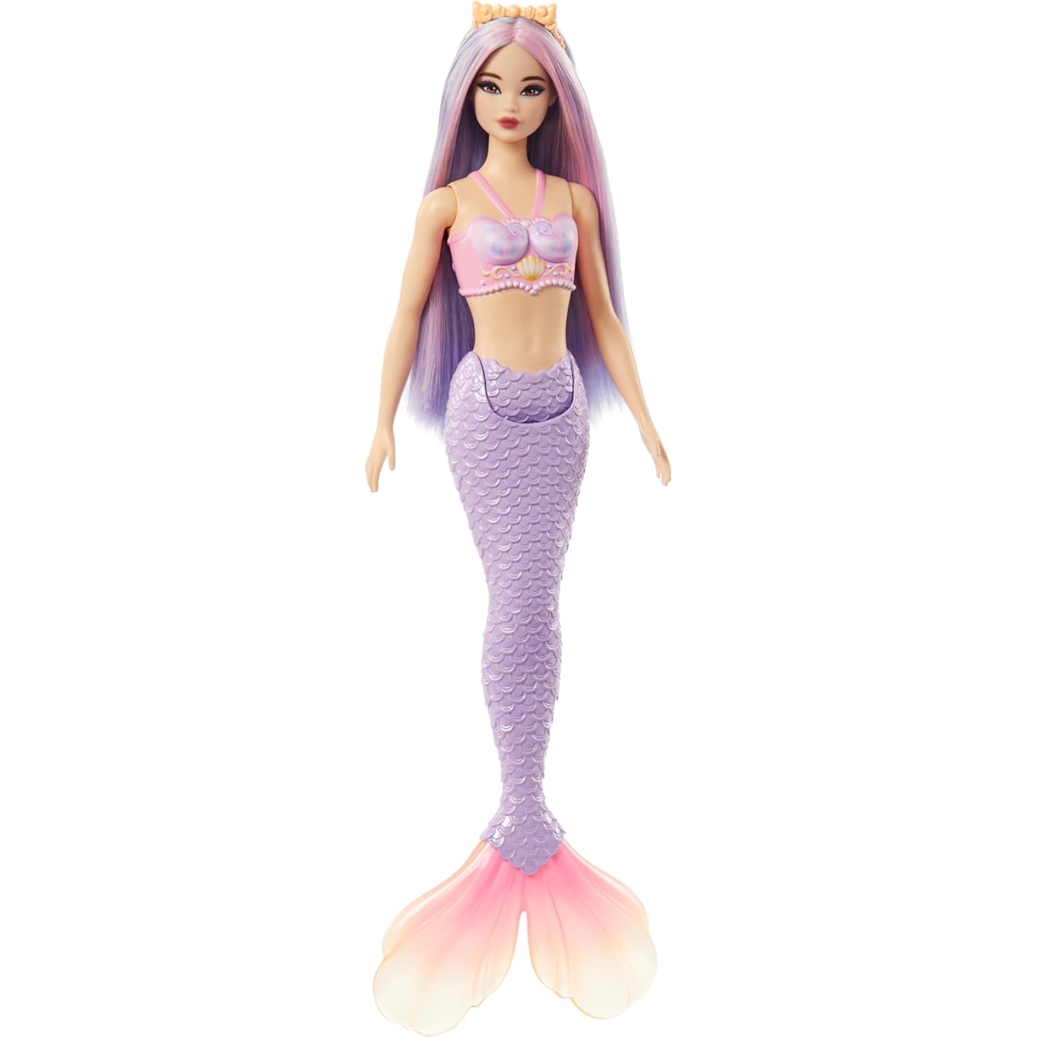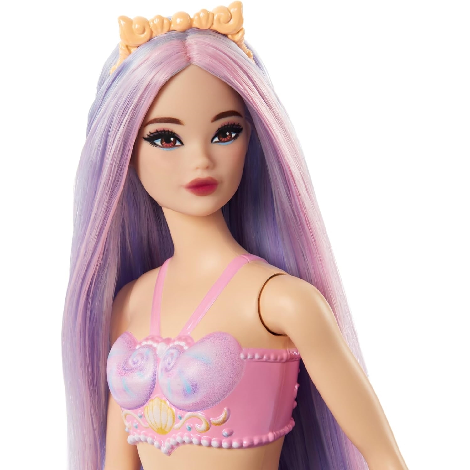 Mattel HRR06 Poupée sirène avec cheveux et bandeau fantaisie - - Les enfants vont adorer imaginer des histoires magiques sous l'eau avec leurs magnifiques poupées Barbie sirène ! - Chaque sirène porte un bustier inspiré des coquillages, une nageoire sculptée et des cheveux de couleur fantaisie avec de superbes accessoires. - Les enfants de 3 ans et plus peuvent collectionner toute une série de sirènes et vivre des aventures aquatiques ! - - - La poupée ne tient pas debout toute seule - À partir de : 3 ans