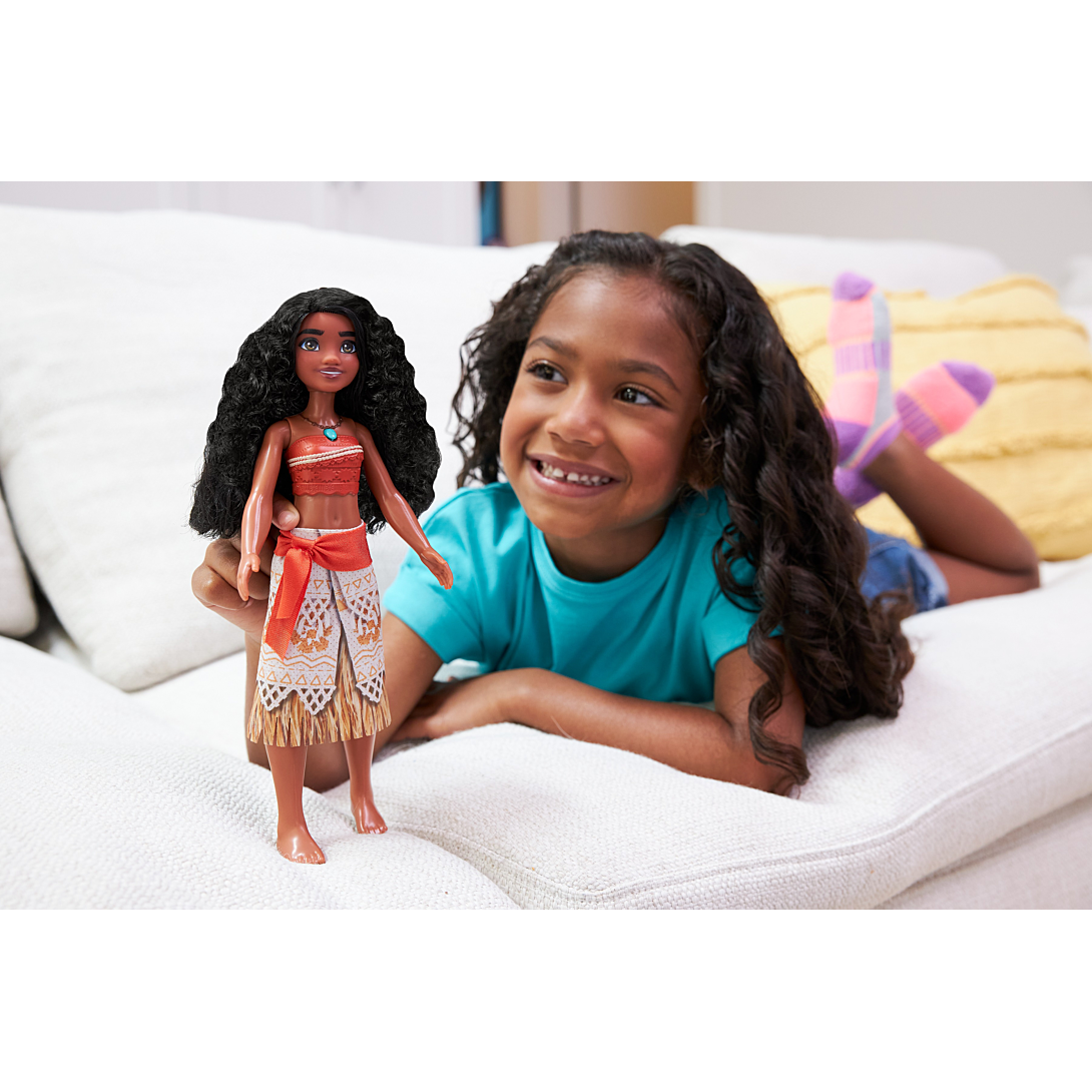| Plus produit | Inspirée du personnage principal du célèbre film danimation Disney, cette poupée Vaiana est prête à répondre à lappel de locéan !\nLes enfants nont quà appuyer sur le pendentif de la poupée Vaiana pour quelle se mette à chanter un extrait de 30 secondes de la chanson phare du film : « Le Bleu lumière ».\nLa poupée Vaiana porte sa tenue emblématique et des cheveux longs frisés que les enfants prendront plaisir à coiffer !\nUne excellente idée de cadeau pour les enfants qui veulent recréer les meilleurs moments du film ou imaginer leurs propres histoires sur Vaiana !\nLes fans peuvent collectionner toutes les poupées chantantes Disney pour encore plus daventures musicales ! Articles vendus séparément. Certains produits peuvent ne pas être commercialisés. |