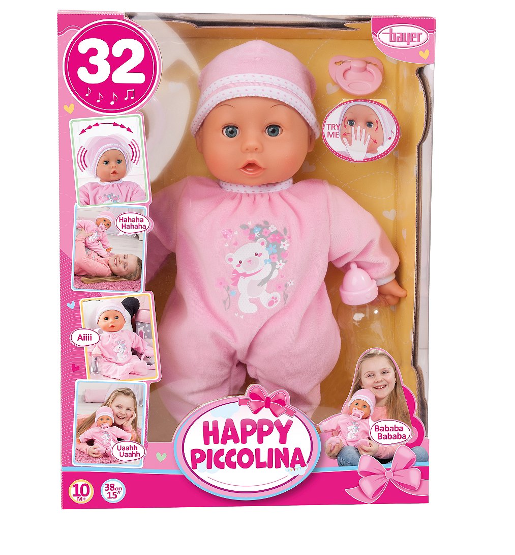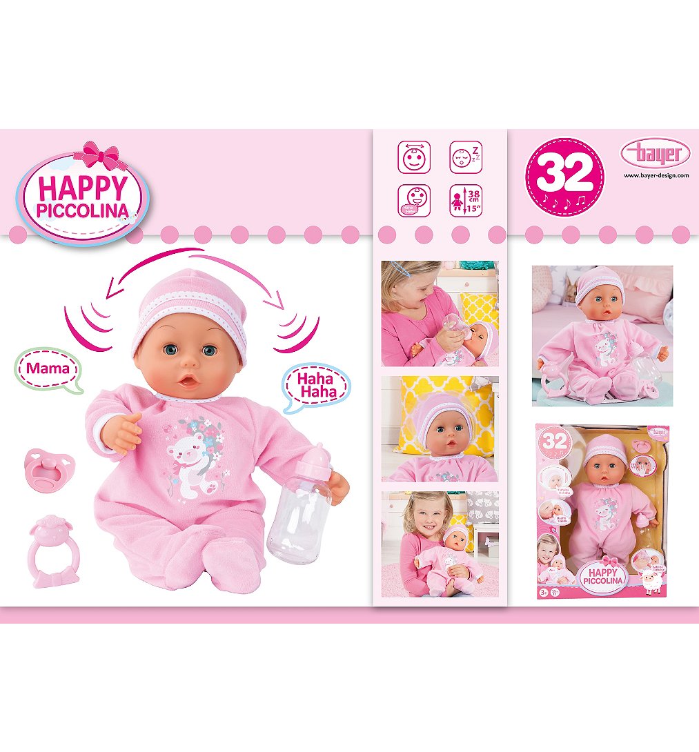 Découvrez Happy Piccolina, le Poupon interactif qui apporte de la joie dans la vie de votre enfant ! Avec ses 38 cm, cet adorable poupon est le compagnon parfait pour des heures de jeu de rôle plein de tendresse et d'imagination.