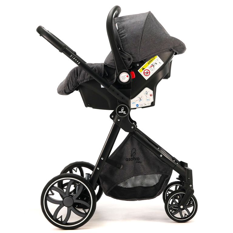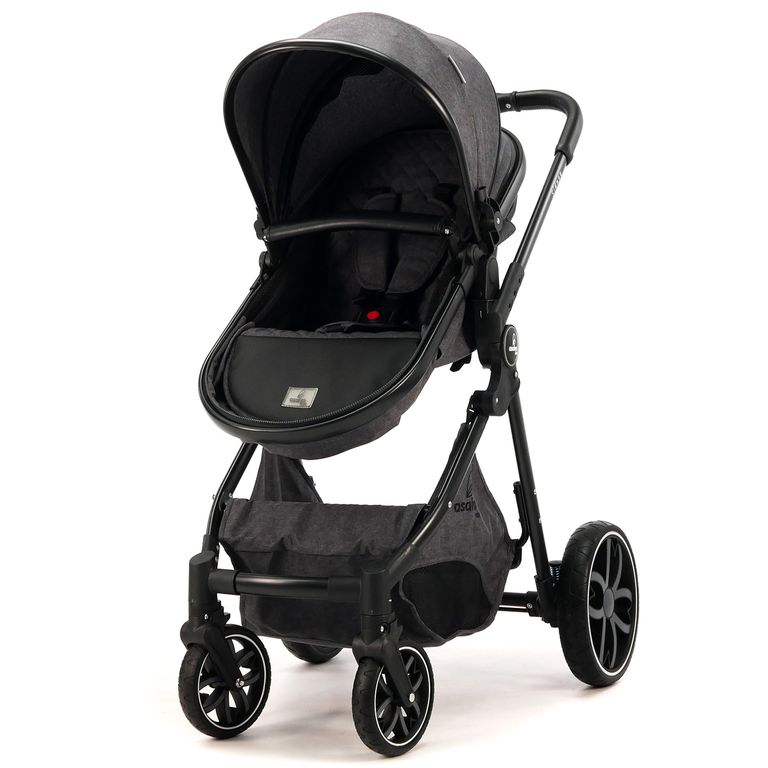 De 0 mois à 15 kg. Comprend : châssis, siège transformable en nacelle, groupe 0, couvre-pieds. Châssis en aluminium. Dossier multipositions avec ruban adhésif. Siège réversible et rabattable dans les deux sens. Suspension réglable sur la roue arrière barre avant et guidon en similicuir. Repose-pieds réglable. Canopée double extensible. Dossier multiposition avec ruban adhésif. Panier en filet.