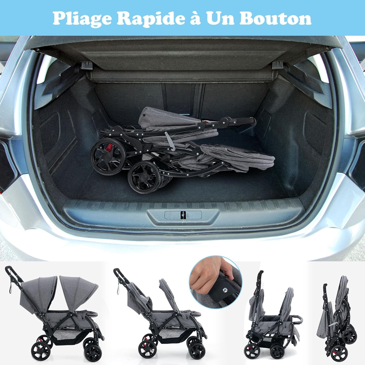 | Libellé | Poussette double pliable, auvent et dossier réglable, harnais, roues verrouillables, charge 30kg (Gris) |