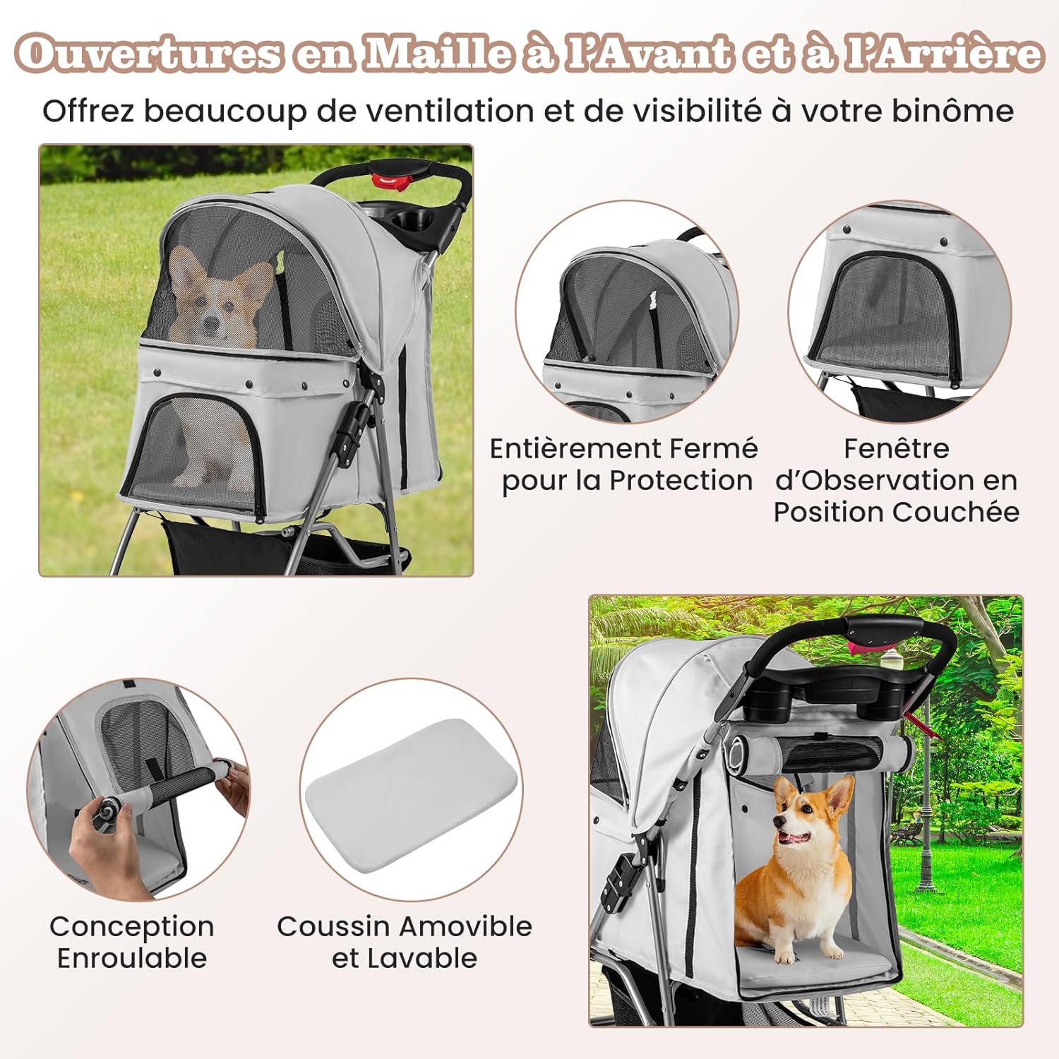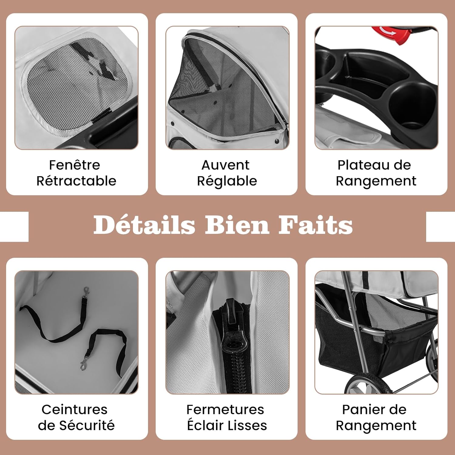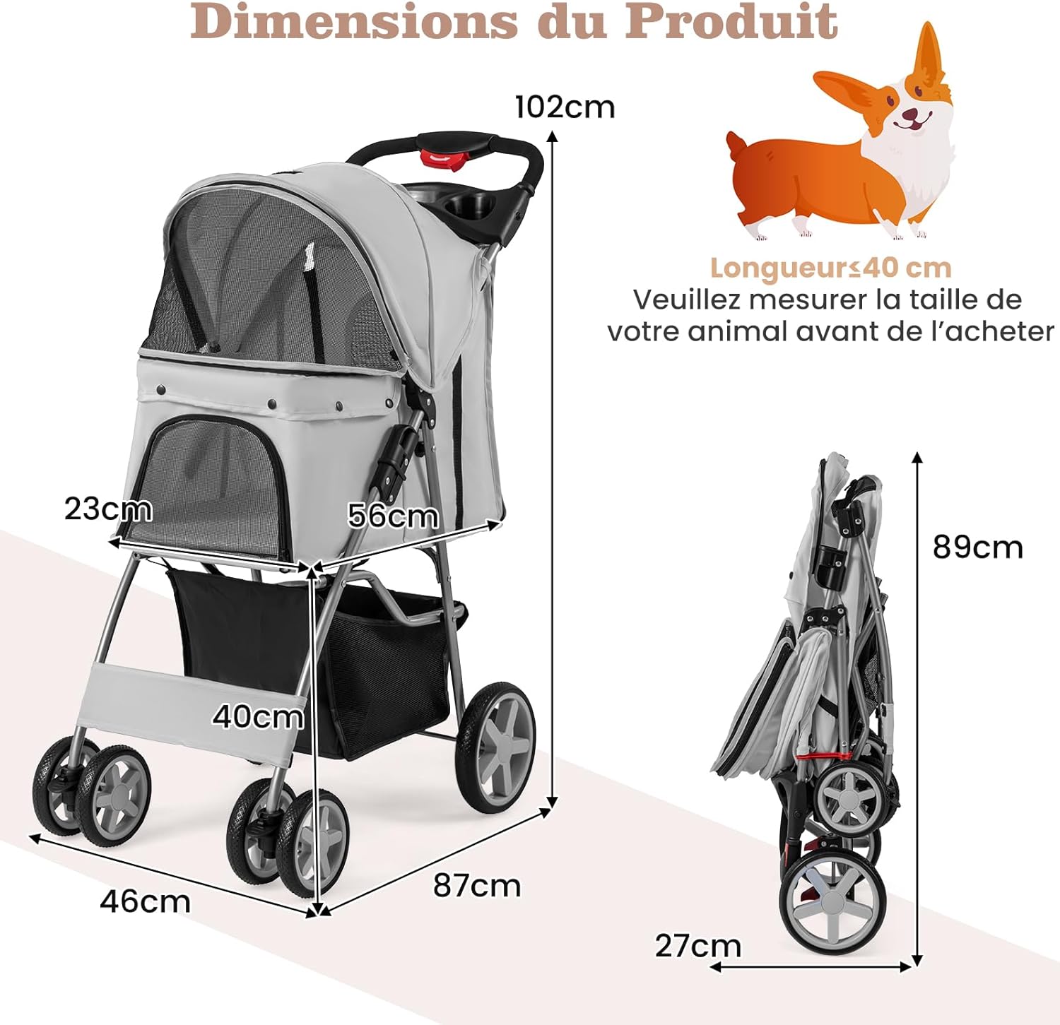 | Libellé | Poussette pliable chien et chat avec panier de rangement et auvent réglable, chariot pour animaux gris |