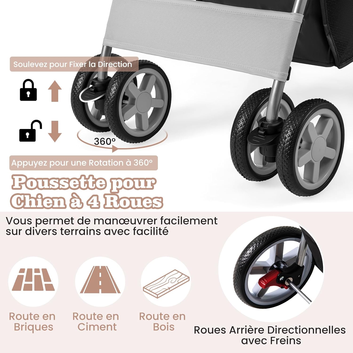 - Conception pratique et sûre : Les 4 roues avant peuvent pivoter à 360 degrés, permettant un transport plus fluide même sur les routes rocheuses. De plus, 4 roues sont en EVA, qui résiste à l'usure. Lorsque les deux freins de sécurité des roues arrière sont fixés, cette poussette pour animaux de compagnie ne glisse pas.