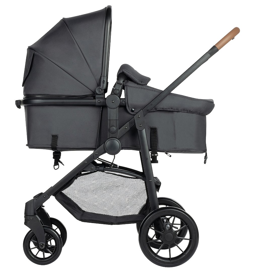 Poussette trio 1er âge avec son siège 2 en 1. Réversible et inclinable, l’assise se transforme en nacelle pour des balades détendues. Très confortable.