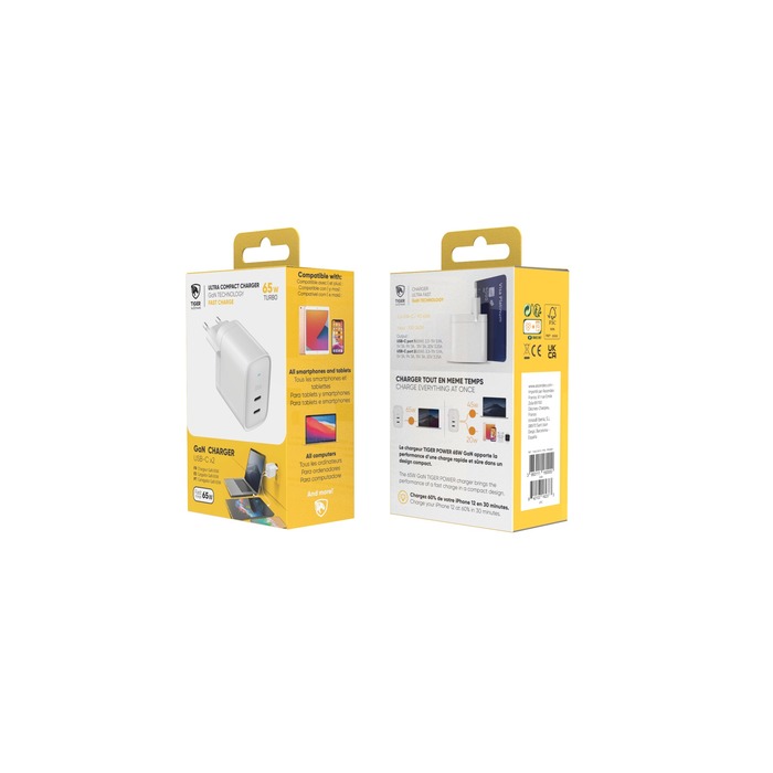 CHARGEUR SECTEUR Tiger TGACC0015 Le chargeur TIGER POWER 65W GaN apporte la performance d'une charge rapide et sûre dans un design compact. Ce chargeur secteur permet de charger deux appareils simultanément avec une puissance maximale de 65W qui se scinde en 20W et 45W lorsque les deux appareils chargent au même moment. -2 ports USB-C -PD 65W -Entrée : 100-240V -Sortie : USB-C port 1(65W): 3.3-11V 5.9A, 5V 3A, 9V 3A, 15V 3A, 20V 3.25A USB-C port 2(65W): 3.3-11V 5.9A, 5V 3A, 9V 3A, 15V 3A, 20V 3.25A -Charge simultanée : USB-C1+USB-C2: 20W+45W= 65W -CI intelligent avec détection automatique et technologie de charge intelligente
