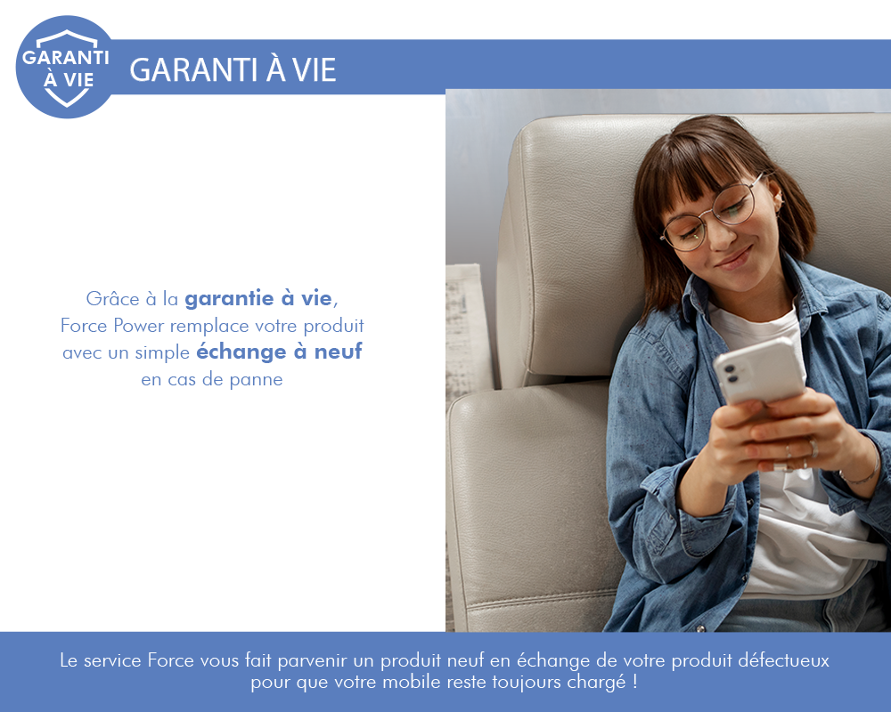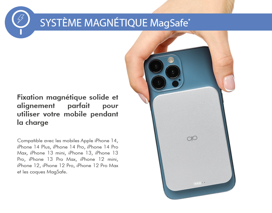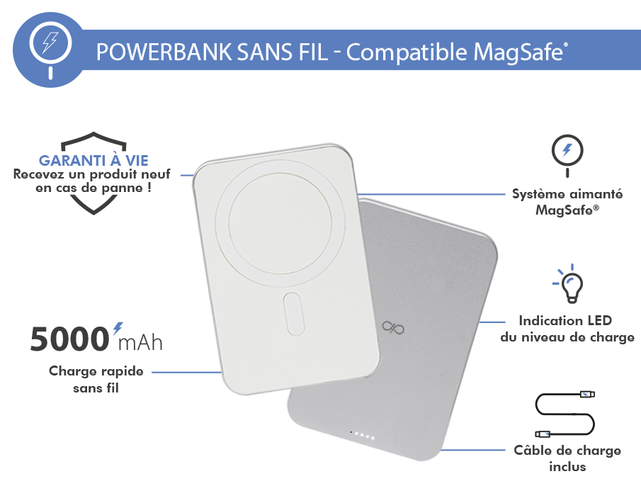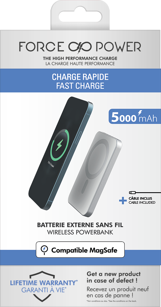 Libellé Powerbank 5000mAh Compatible MagSafe Garanti à vie Induction 15W Gris Force Power