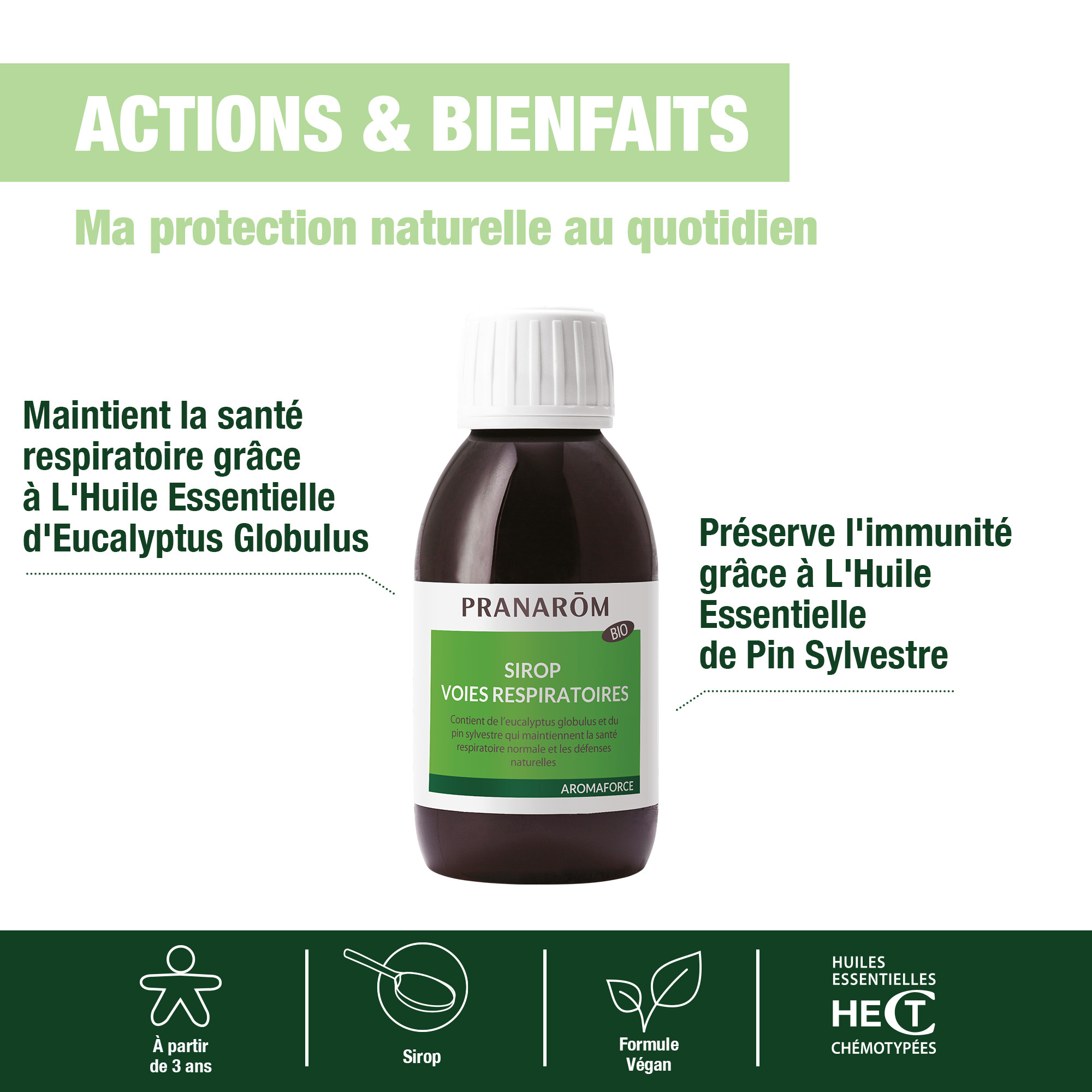 Le sirop Voies respiratoires est spécialement conçu pour soutenir la santé des voies respiratoires et préserver les défenses immunitaires. • Soulage les inconforts respiratoires : grâce à l’action apaisante des Huiles Essentielles de Pin Sylvestre et de Sarriette des Montagnes, ce sirop contribue à apaiser les gorges sensibles. • Favorise une respiration aisée : le Pin Sylvestre et l’Eucalyptus globulus aident à dégager les voies respiratoires. • Renforce les défenses naturelles : L'essence de Citronnier et l'huile Essentielle de Cannelle de Chine soutiennent les défenses naturelles de l'organisme. • Ce sirop à l'effet rafraîchissant n'entraîne pas d'accoutumance et convient ainsi à toute la famille, enfant (dès 3 ans) comme adulte, pour une respiration aisée La gamme Aromaforce regroupe le meilleur des Huiles Essentielles contre les inconforts de l'hiver, sous différentes formes et adaptées à toute la famille. PRANARÔM, LA SCIENCE DES HUILES ESSENTIELLES : Pranarôm expert de la science des Huiles Essentielles, propose depuis plus de 30 ans, des solutions ciblées, innovantes et naturelles pour maintenir toute la famille en bonne santé au quotidien.