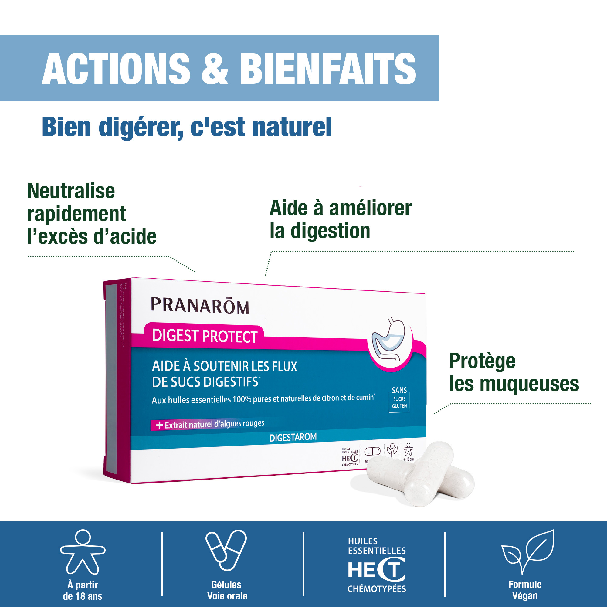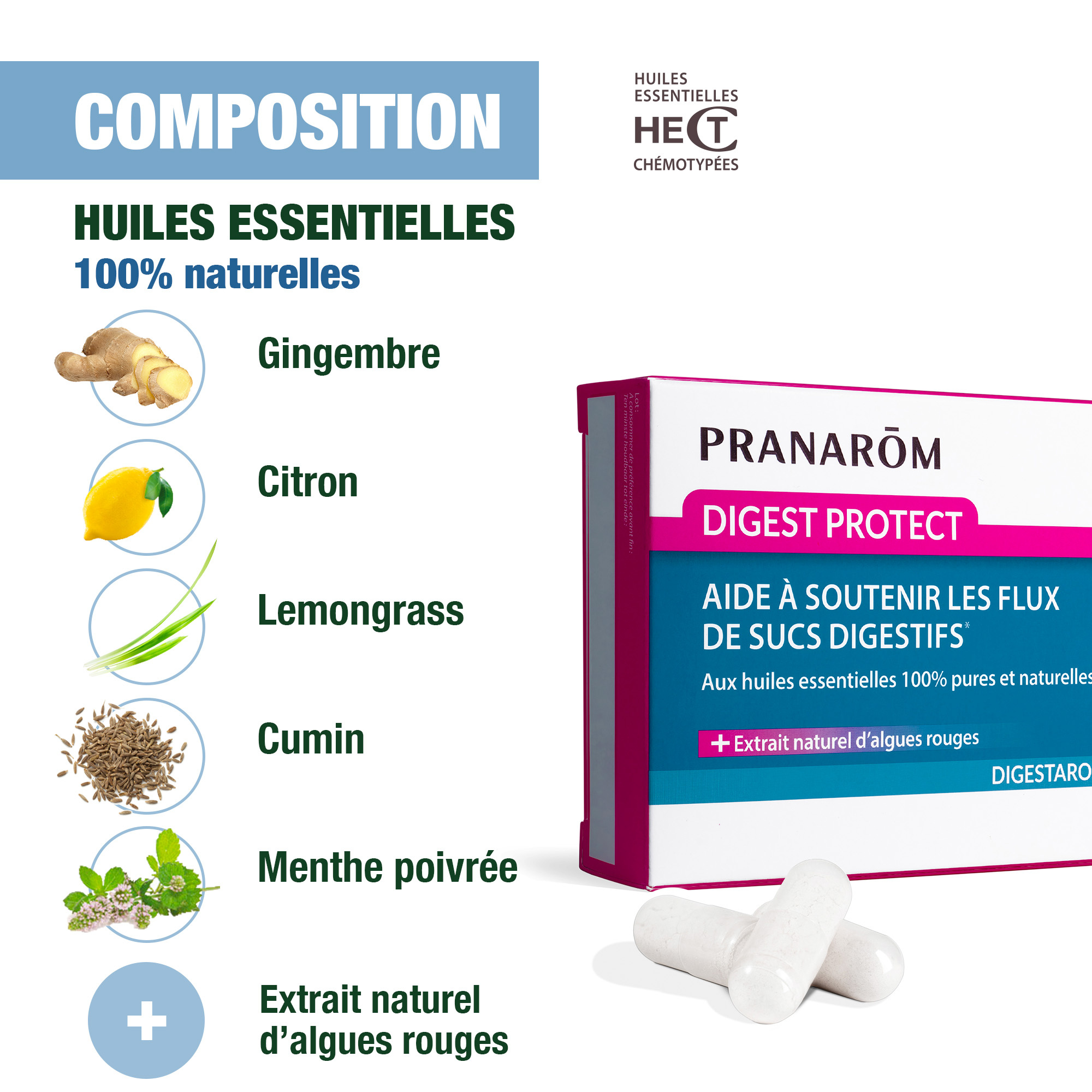 SOUTIENT LA DIGESTION APRES LES REPAS : DIGEST PROTECT est une innovation des laboratoires Pranarôm, conçue pour soutenir les flux de sucs digestifs et pour offrir un confort digestif amélioré, particulièrement après les repas. DES ACTIFS NATURELS ET EFFICACES : Combinant la racine de guimauve, la poudre de lithothamne et des huiles essentielles BIO, cette solution aide à optimiser la digestion dans sa globalité et à rétablir l'équilibre digestif. COMPOSITION SAINE : DIGEST PROTECT est élaboré avec des ingrédients entièrement naturels, sans gluten, sans sucre, sans édulcorants ni autres composants controversés. HUILES ESSENTIELLES 100% PURES, NATURELLES ET INTÉGRALES : Les huiles essentielles chémotypées de Cumin, Citronnier, Lemongrass, Gingembre et Menthe poivrée, toutes issues de l'agriculture biologique , travaillent en synergie avec la poudre de lithothamne et l’extrait de racine de guimauve pour un confort digestif renforcé. GAMME DIGESTAROM : Digest PROTECT fait partie de DIGESTAROM, la gamme pionnière de digestion naturelle aux Huiles Essentielles 100% pures et biologiques. PRANARÔM, LA SCIENCE DES HUILES ESSENTIELLES : Le laboratoire Pranarôm, expert des Huiles Essentielles, propose des solutions innovantes et naturelles conçues à partir d’Huiles Essentielles chémotypées 100% pures, intégrales et biologiques.