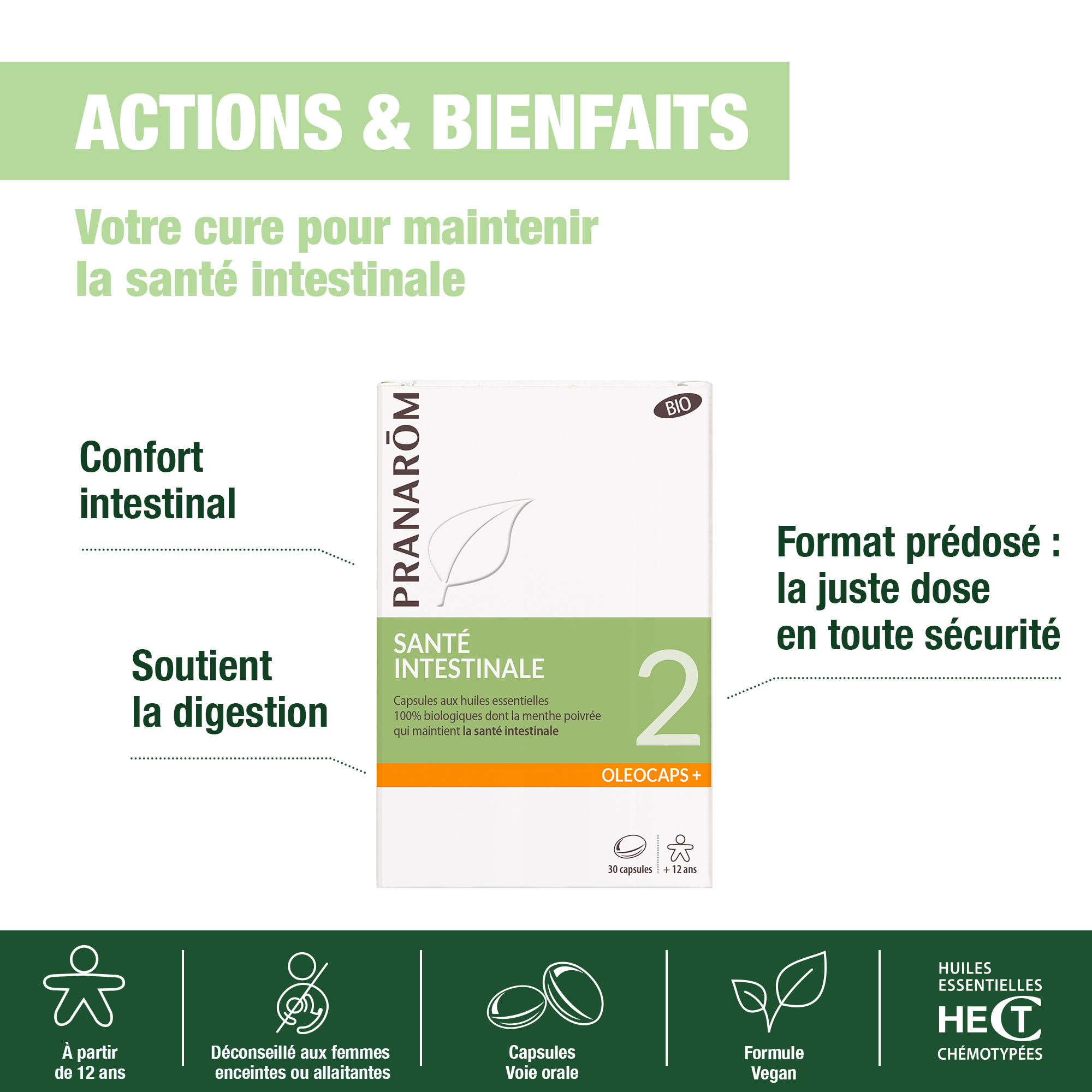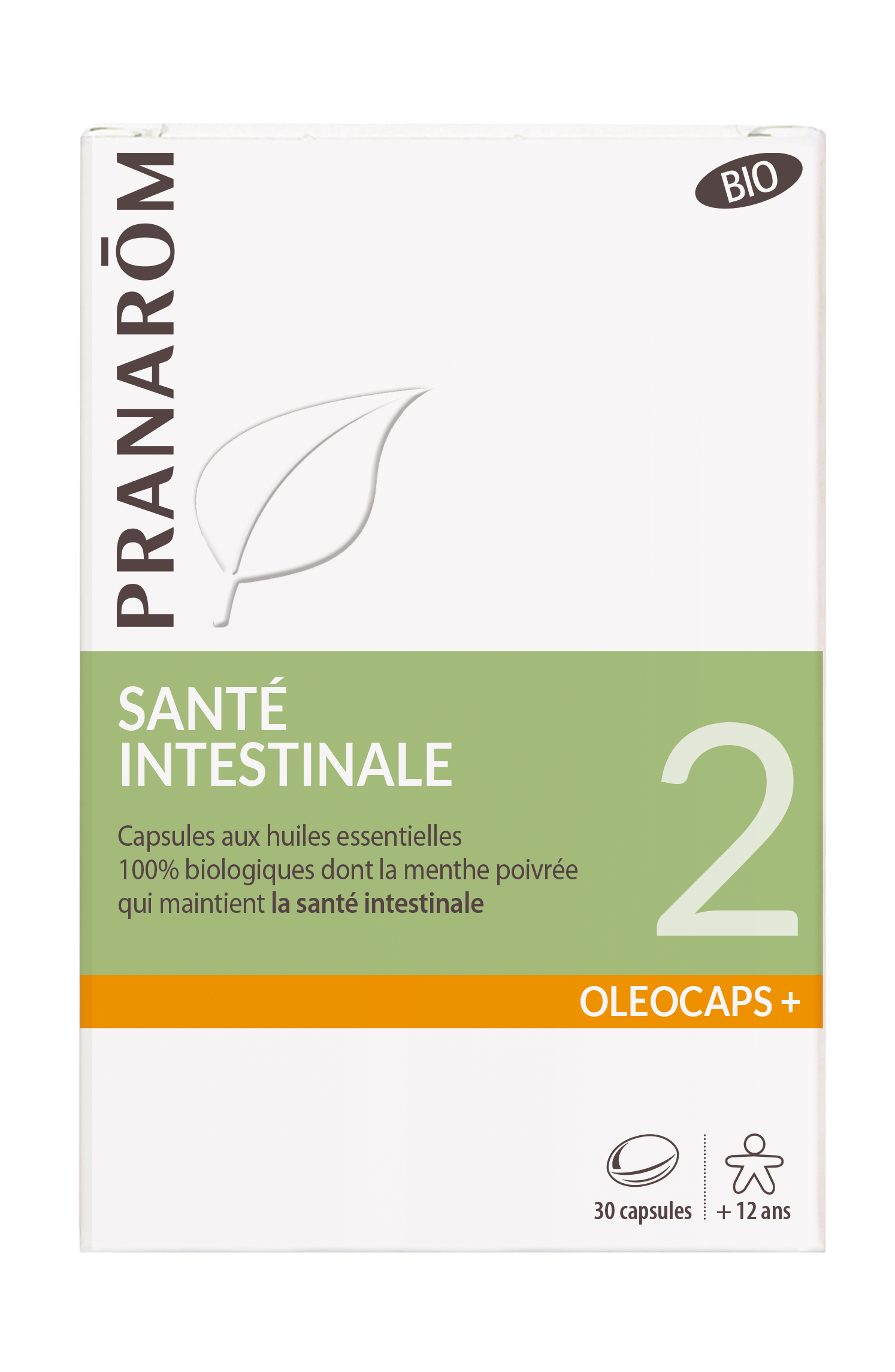 MAINTIENT LE CONFORT INTESTINAL : Les Capsules Oléocaps +2 Santé Intestinale soutiennent le confort gastrique et offrent un soulagement en toute circonstance. UNE SYNERGIE CIBLÉE : Formulée à partir d'huiles essentielles de Menthe poivrée, d'Origan vulgaire, de Cannelle de Chine et d'essence de citronnier pour aider à maintenir le confort intestinal en cas de coup de besoin ou lors de vos voyages. CONSEILS D'UTILISATION : À partir de 12 ans, une capsule au début ou pendant le repas, 1 à 3 fois par jour pendant 7 jours. À avaler avec un peu d’eau. Ne pas utiliser pendant la grossesse et pendant l’allaitement. HUILE ESSENTIELLE HECT (CHÉMOTYPÉE) : Le label HECT est un gage de qualité sélectionnant des plantes botaniquement certifiées garantissant une huile essentielle 100 % pure et naturelle pour votre bien-être. PRANARÔM, LA SCIENCE DES HUILES ESSENTIELLES : Pranarôm allie son expertise scientifique à son amour des plantes afin de proposer des solutions ciblées pour maintenir toute la famille en bonne santé au quotidien.