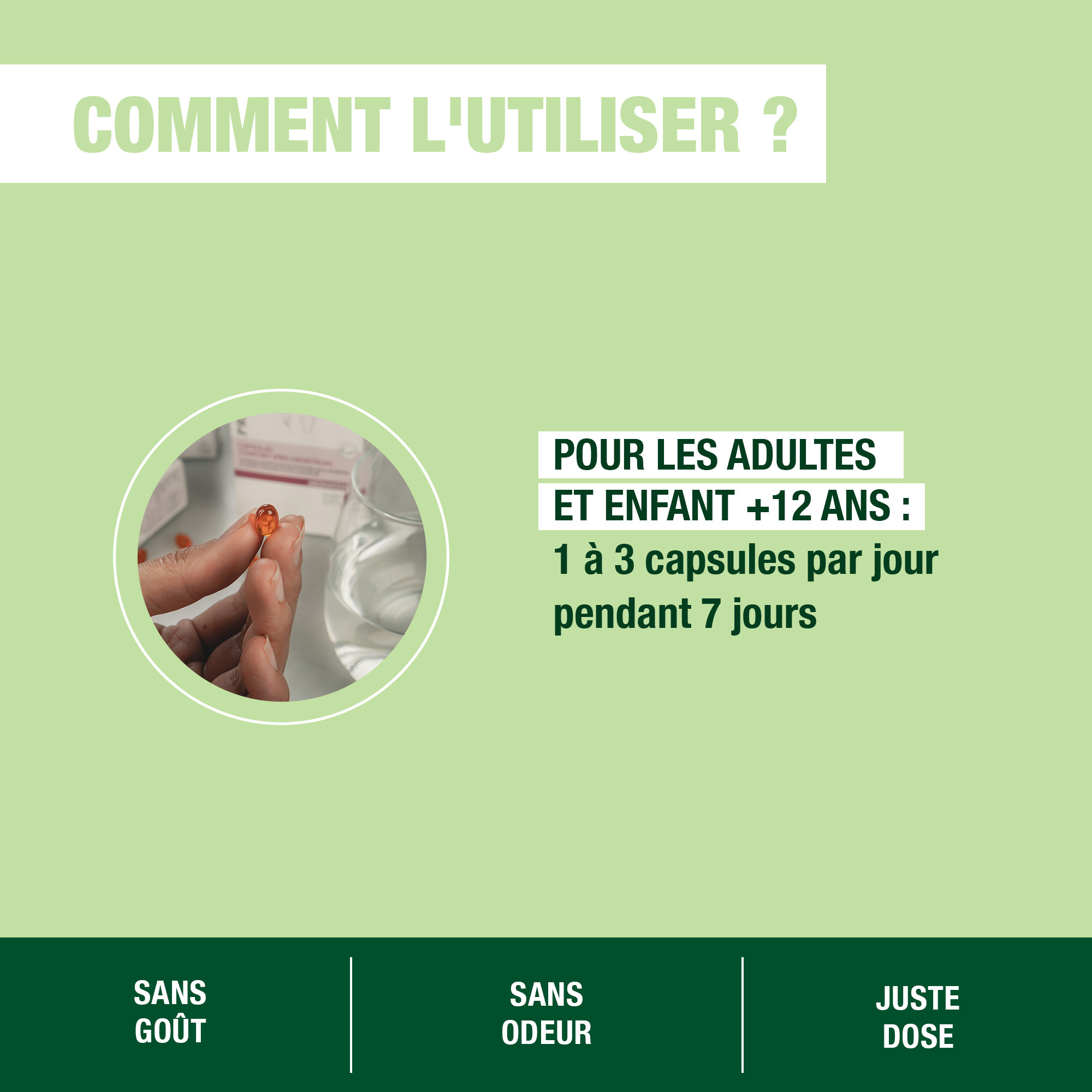A avaler avec un peu d’eau. 1 capsule au début ou pendant le repas, 3 fois par jour durant 7 jours.