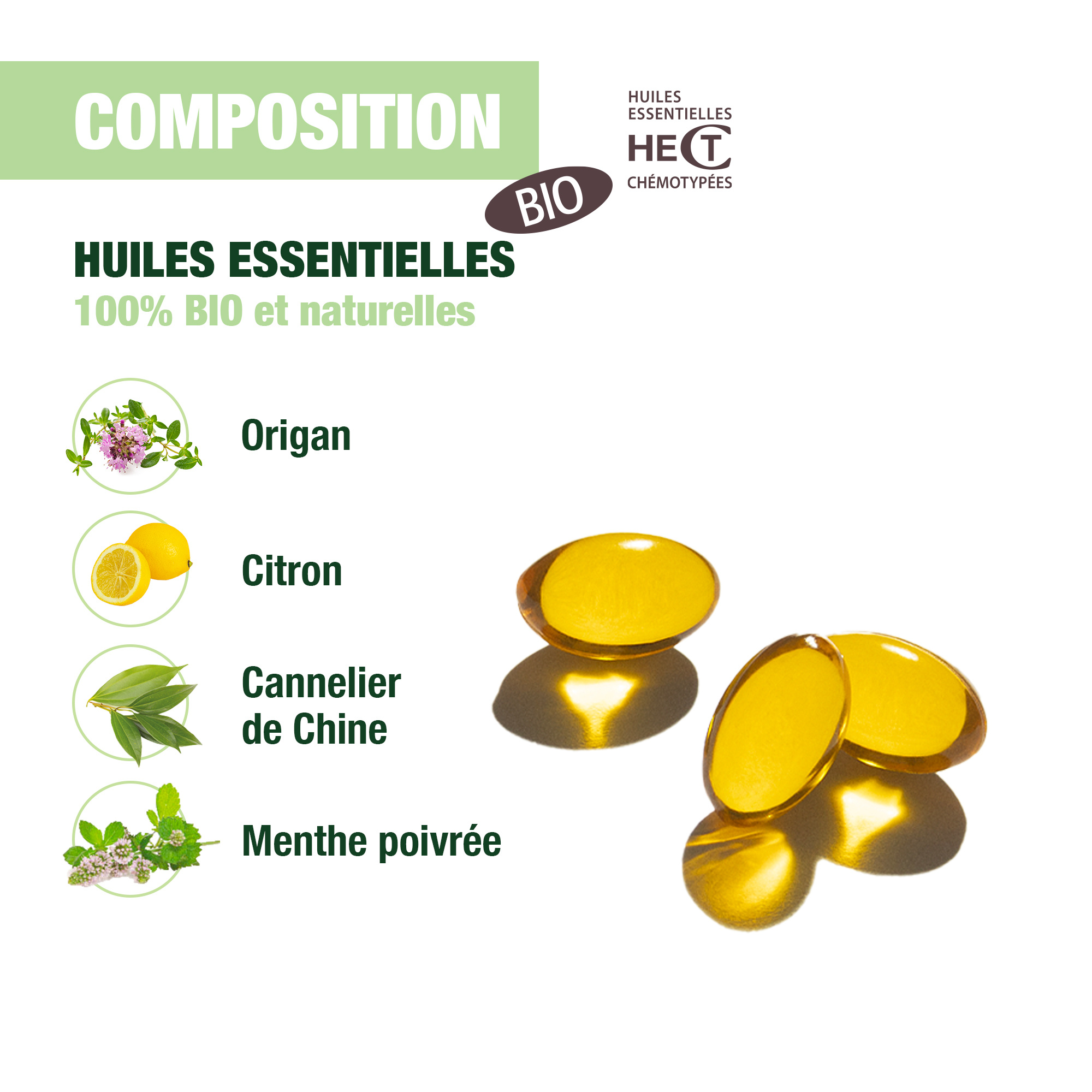 Ingrédients : Huile végétale: Brassica napus* (Colza); Gelatin* (Gélatine); Glycerin* (Glycérine); Huiles essentielles: Origanum vulgare* (Origan), Cinnamomum cassia* (Cannelier de Chine), Citrus limon* (Citron), Mentha piperita* (Menthe poivrée); Antioxidant: Extrait riche en tocopherol.