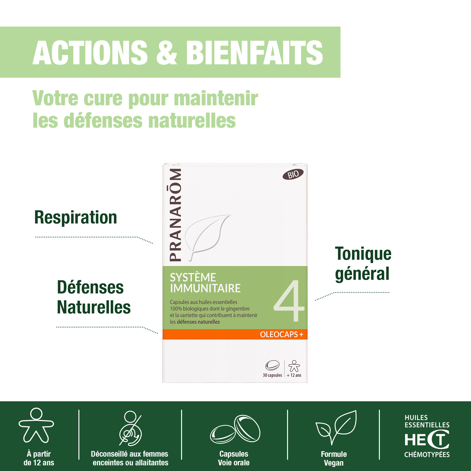 | Libellé | Pranarom - Oléocaps + 4 - Système Immunitaire - Aux Huiles Essentielles Ciblées - Eucalyptus Radié, Citron, Gingembre, Giroflier & Sarriette - 100% N |