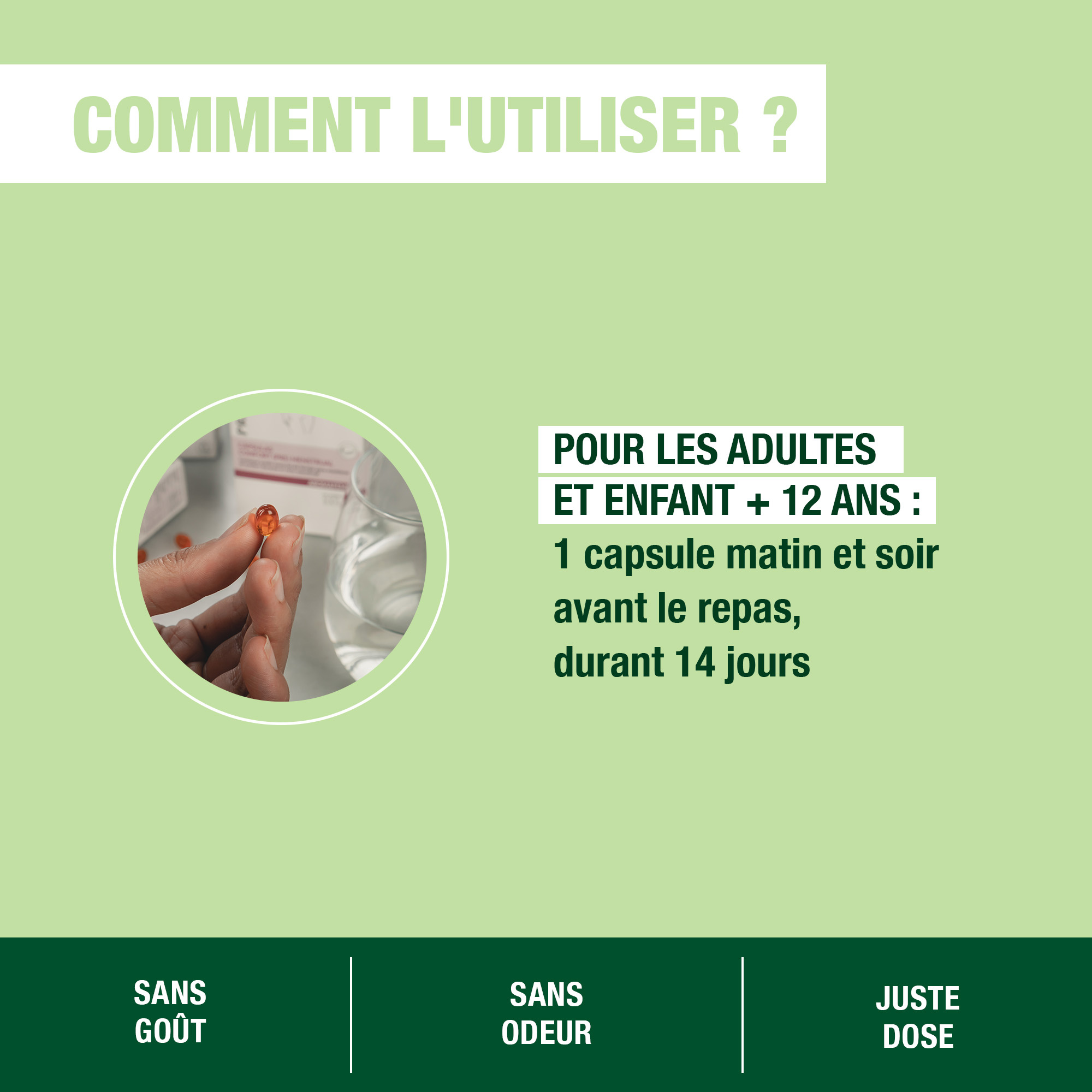 A avaler avec un peu d’eau. 1 capsule matin et soir avant le repas, durant 14 jours – renouveler la cure selon les besoins, de 2 à 4 fois par an (surtout au printemps et en automne).