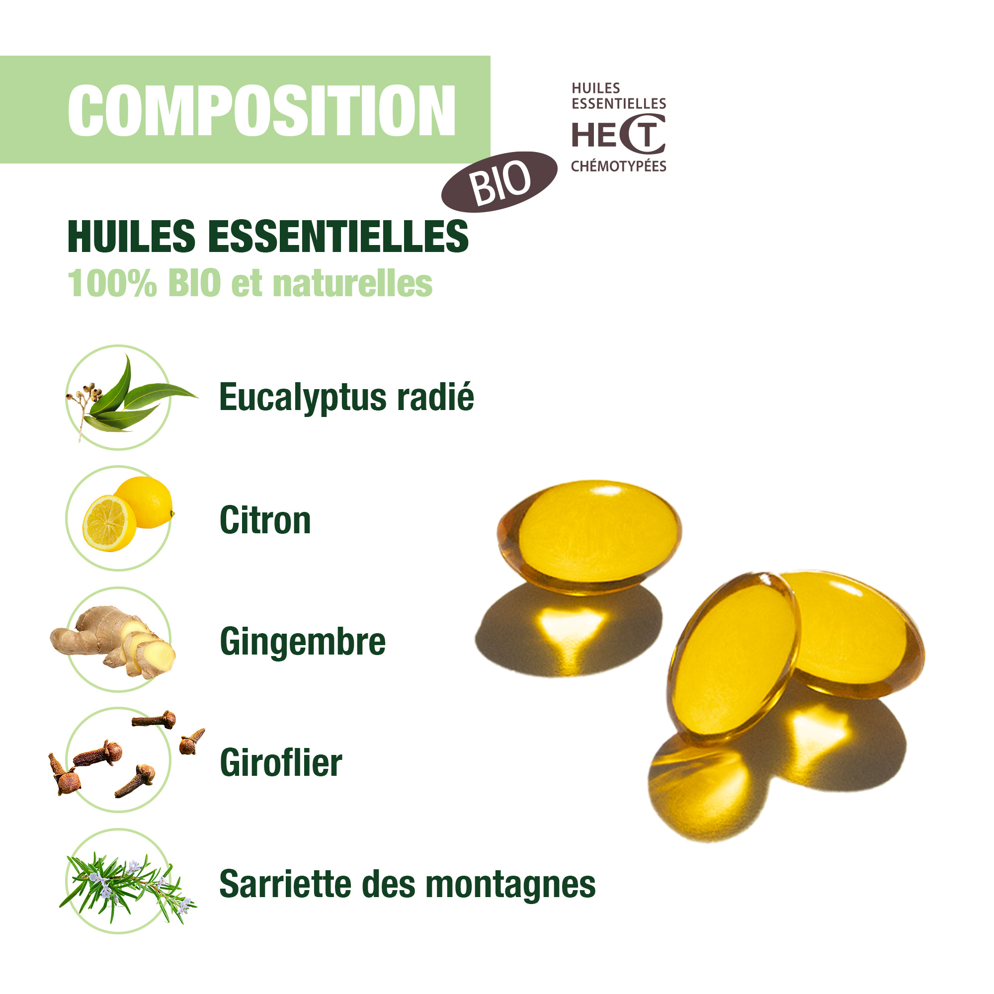 Ingrédients : Huile végétale: Brassica napus* (Colza); Gelatin* (Gélatine); Glycerin* (Glycerine); Huiles essentielles: Mentha piperita* (Menthe poivrée), Citrus limon*(Citron), Zingiber officinale* (Gingembre), Elettaria cardamomum* (Cardamome), Citrus reticulata* (Mandarinier), Juniperus communis* (Genévrier). antioxidant : Extrait riche en tocopherol.