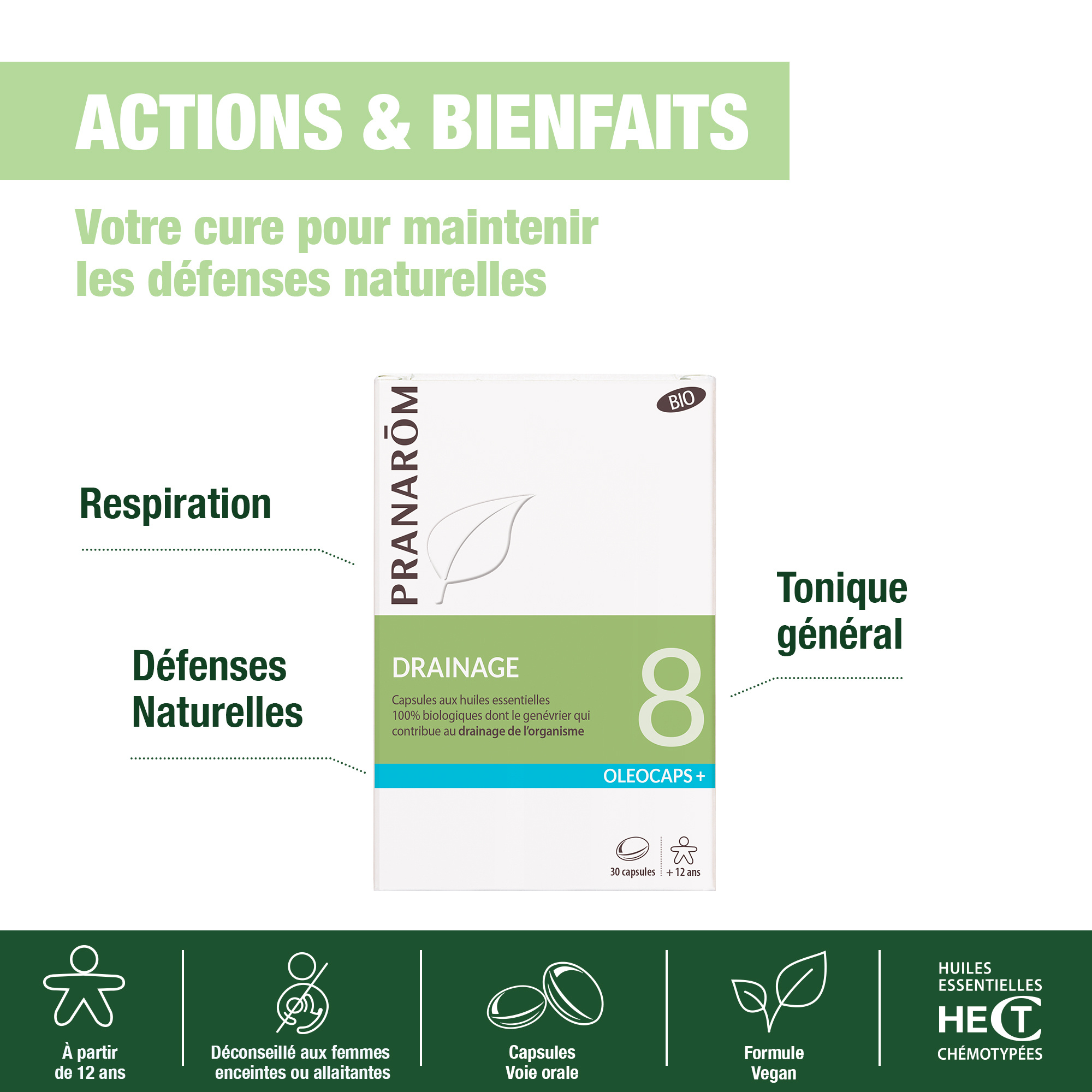 CURE DÉTOX & MINCEUR : Les capsules Oléocaps+8 Drainage aux Huiles Essentielles bio soutiennent l’activité des émonctoires et éliminent les toxines de l’organisme. UNE SYNERGIE CIBLÉE : Formulées à partir d'huiles essentielles de Menthe poivrée, de Gingembre, de Cardamome, de Genévrier, d'essence de Citronnier et de Mandarinier pour contribuer au drainage de l'organisme dans le cadre d'un projet bien-être ou minceur. CONSEILS D'UTILISATION : À partir de 12 ans, une capsule matin et soir avant le repas pendant 14 jours. Cette cure peut être renouvelée jusqu'à 4 fois par an. À avaler avec un peu d’eau. Ne pas utiliser pendant la grossesse et pendant l’allaitement. HUILE ESSENTIELLE HECT (CHÉMOTYPÉE) : Le label HECT est un gage de qualité sélectionnant des plantes botaniquement certifiées garantissant une huile essentielle 100 % pure et naturelle. PRANARÔM, LA SCIENCE DES HUILES ESSENTIELLES : Pranarôm allie son expertise scientifique à son amour des plantes afin de proposer des solutions ciblées pour maintenir toute la famille en bonne santé au quotidien.