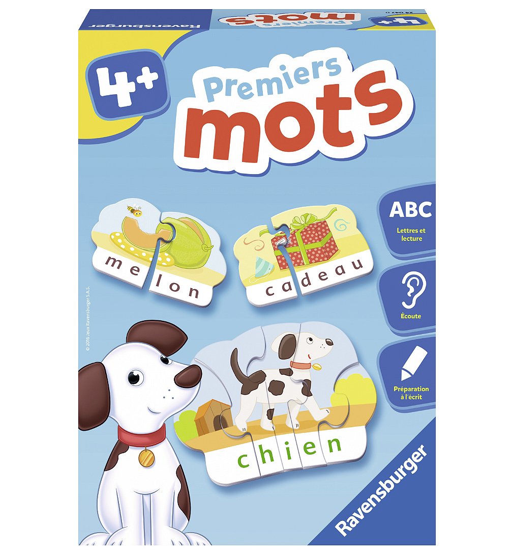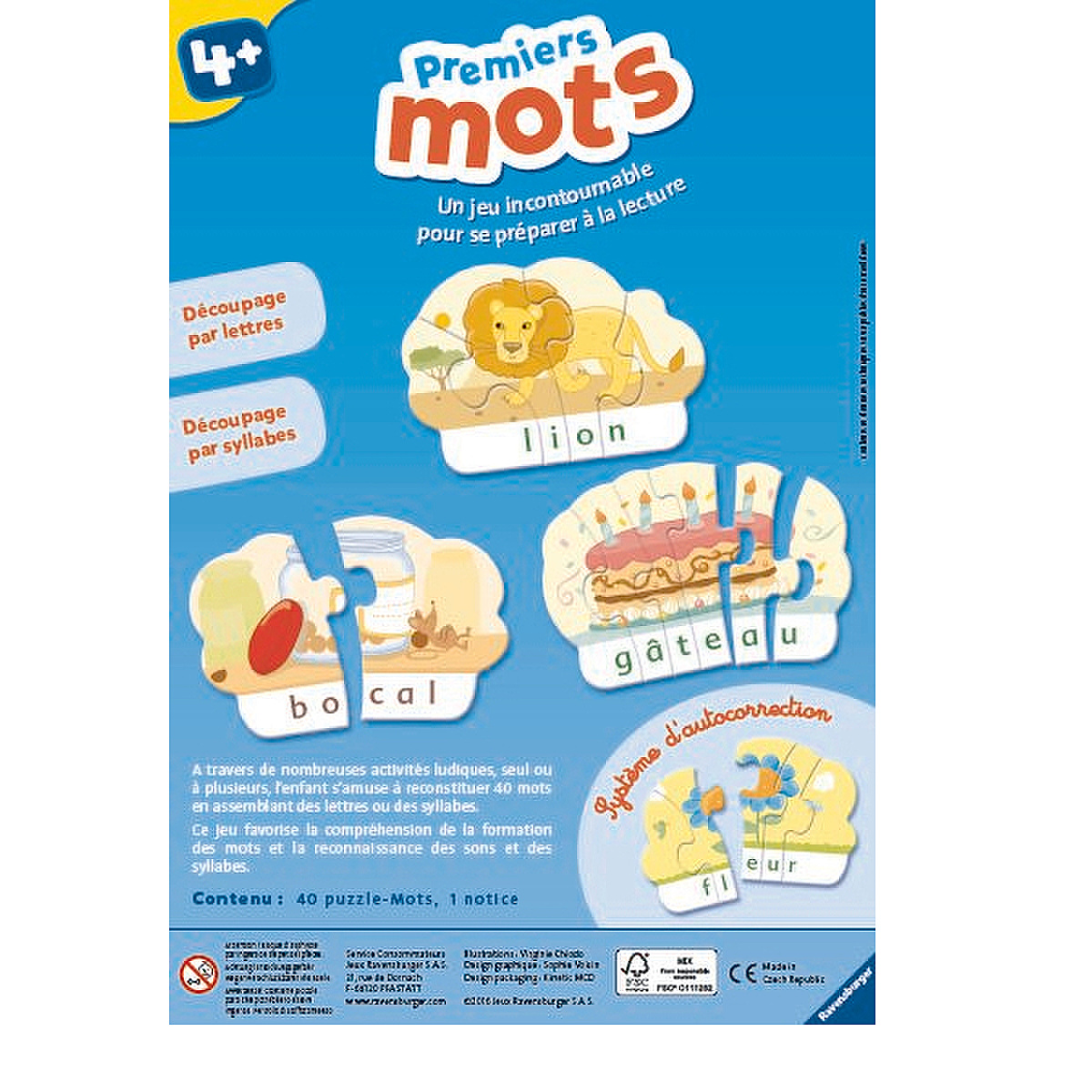 | Plus produit | Un jeu incontournable pour se préparer à la lecture ! C\'est la première étape qui prépare lenfant à lire ses premiers mots et ses premières syllabes . Les puzzles-mots accompagnent l\'enfant tout au long du jeu pour comprendre les syllabes qui composent le mot. Apprendre à lire n\'a jamais été aussi facile ! Le découpage des mots en lettres et en syllabes est une étape essentielle pour préparer lenfant à réussir son entrée en lecture. Ce jeu permet ainsi la compréhension de la formation des mots et la reconnaissance des phonèmes. En plus de lapprentissage de la lecture, ce jeu favorise sa capacité de concentration, d\'écoute et de raisonnement. A travers de nombreuses activités ludiques, seul ou à plusieurs, lenfant samuse à reconstituer 40 mots en assemblant des lettres ou des syllabes. Les jolies illustrations colorées qui accompagnent chaque mot et la découpe auto-corrective des cartes-puzzle permettent aux enfants de vérifier eux-mêmes leurs réponses. Contenu: 40 puzzles : 20 mots-syllabes, 20 mots-lettres, 1 notice. Ce produit est composé de matériaux issus de forêts bien gérées certifiées FSC®, de matériaux recyclés et de matériaux issus dautres sources contrôlées (FSC-C111262). Produit imaginé en France et fabriqué en Europe. Ce coffret s\'accompagne d\'une collection entière pour les enfants dès 4 ans. Le coffret \'J\'écris l\'alphabet\' ou \'le jeu du corps humain\' avec un appareil radiologique pour tout connaitre sur le corps humain. Retrouver pour chaque âge de 2 à 5 ans une multitude de jeux basés sur les notions essentielles et sur des connaissances à acquérir. |