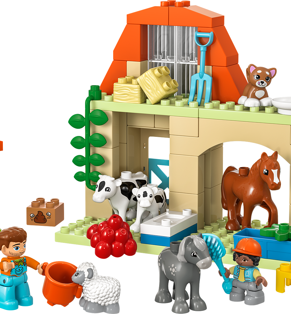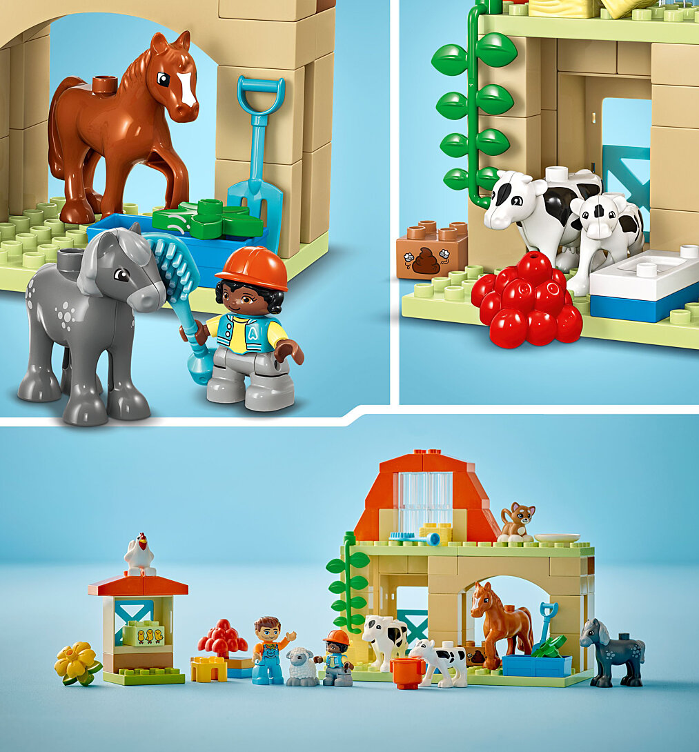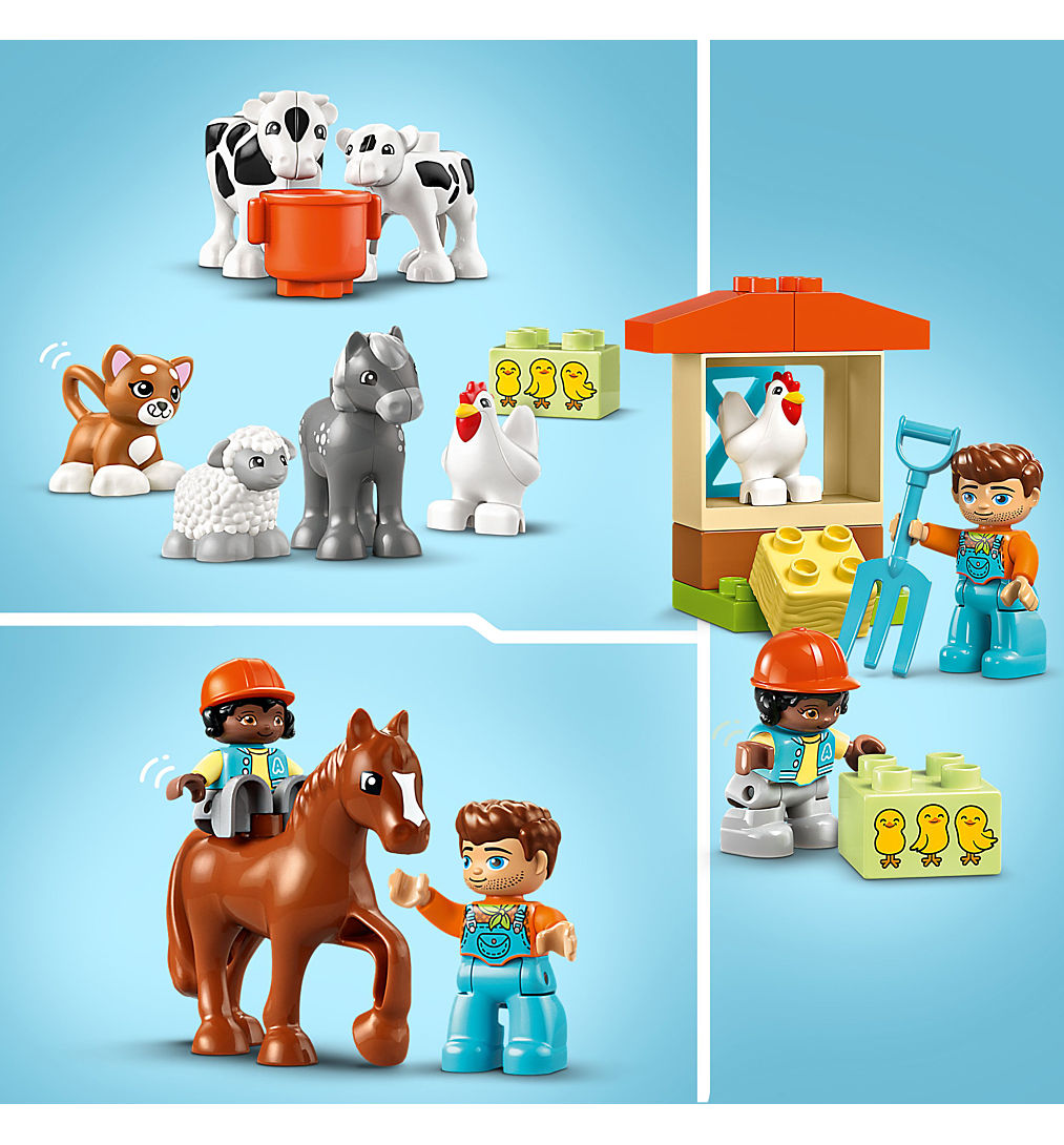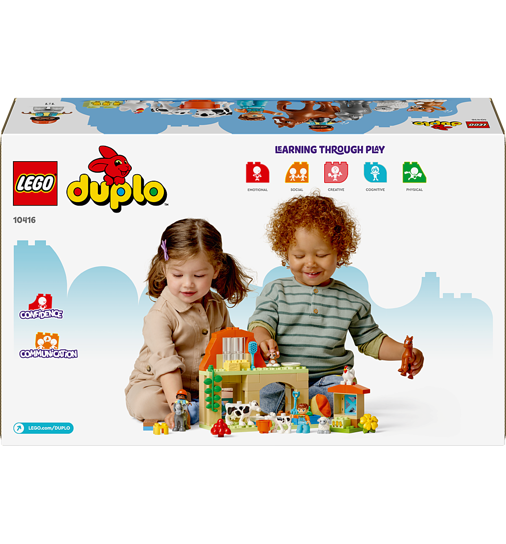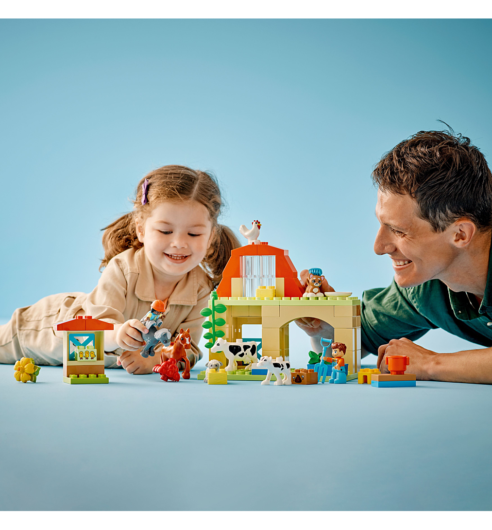 Créez des moments de jeu inoubliable avec le jouet d'apprentissage LEGO DUPLO Prendre Soin des Animaux à la Ferme (10416) pour les enfants âgés de 2 ans et plus. Ce jouet d'apprentissage pour les tout-petits est livré avec 8 figurines d'animaux LEGO DUPLO - notamment des figurines de cheval, de mouton, de vache et de poule - pour ravir tous les tout-petits qui aiment les jouets de jeu de rôle réalistes et se faire de nouveaux amis de la ferme. Ce jouet de ferme riche en fonctionnalités immerge les familles dans un jeu de soin, où les adultes montrent à leur enfant d'âge préscolaire comment nourrir et prendre soin des animaux. Le fermier dans la ferme aide l'enfant à laver les pommes pour les donner à la vache et à son veau. Dans le poulailler, la poule prend soin de ses poussins. Les tout-petits peuvent également imaginer monter sur la figurine de cheval et lui donner du foin dans l'écurie. Ce jouet éducatif se compose de briques et de pièces colorées conçues pour captiver les tout-petits pendant qu'ils explorent et assemblent, tout en développant leurs compétences en résolution de problèmes et leurs compétences motrices fines.