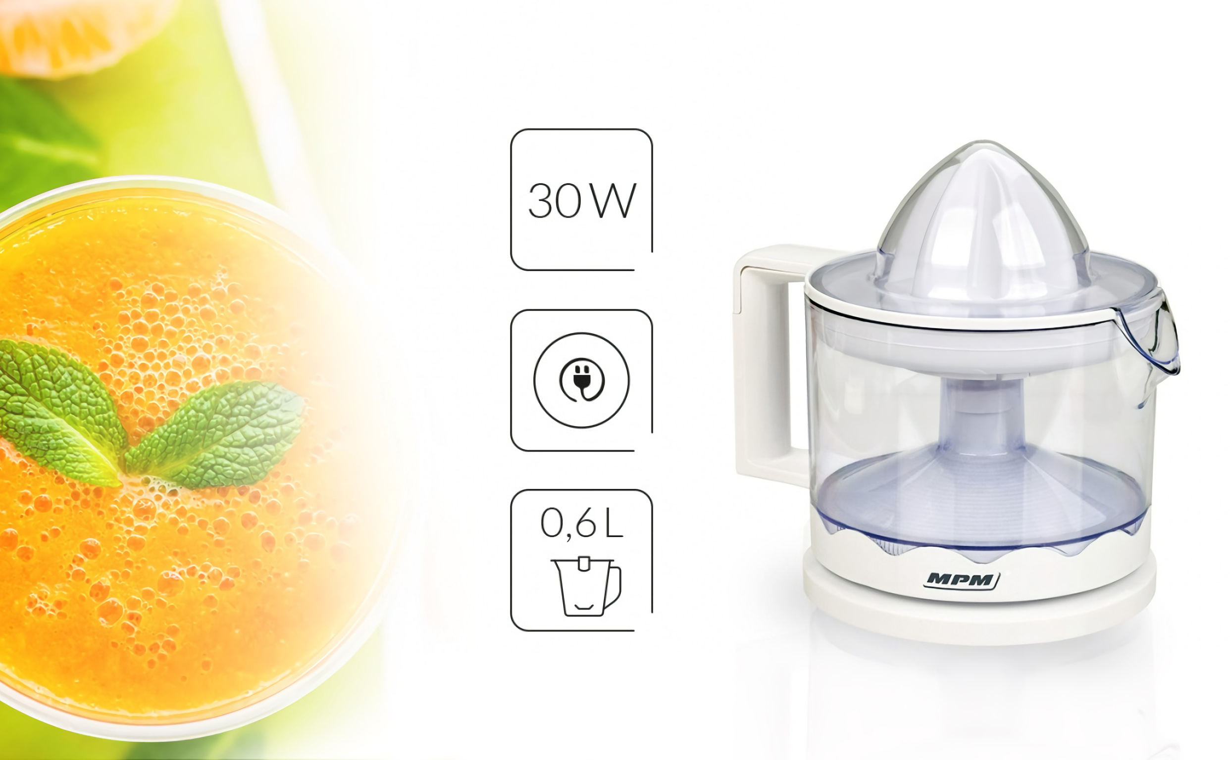 Presse Agrumes Électrique Jus d'orange, Pichet 600ml, sans BPA, 2 Sens Rotation 30 Blanc MPMMWC-02