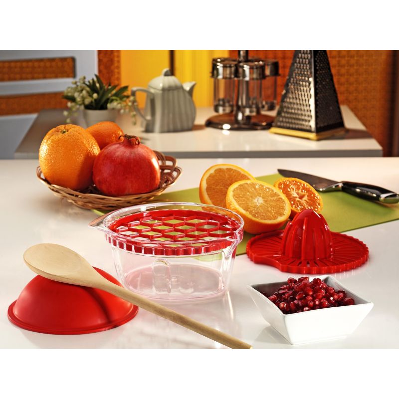 Cet outil enlève les graines de grenade et presse jusqu'à la dernière goutte de jus de citrons, d'oranges, de citrons verts, d'agrumes et même de petits pamplemousses.
