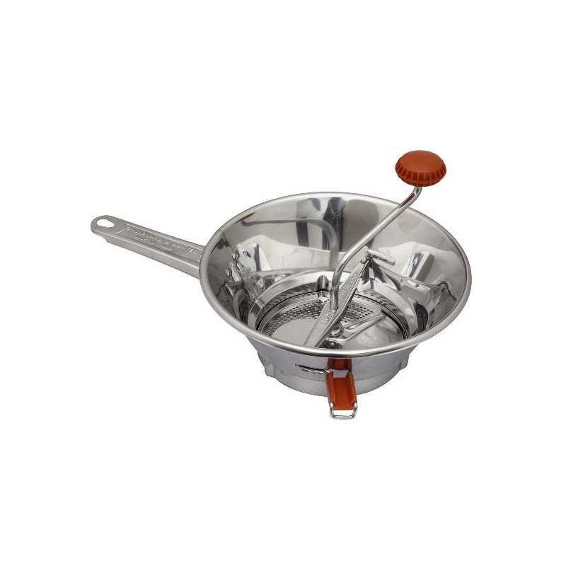 | Plus produit | Poignée ergonomique, 3 grilles interchangeables (petits, moyens, gros trous), large cuve conique, base surélevée pour évacuation et stabilité, dents latérales de maintien, bouton de manivelle en plastique, inoxydable pour longue durée. |