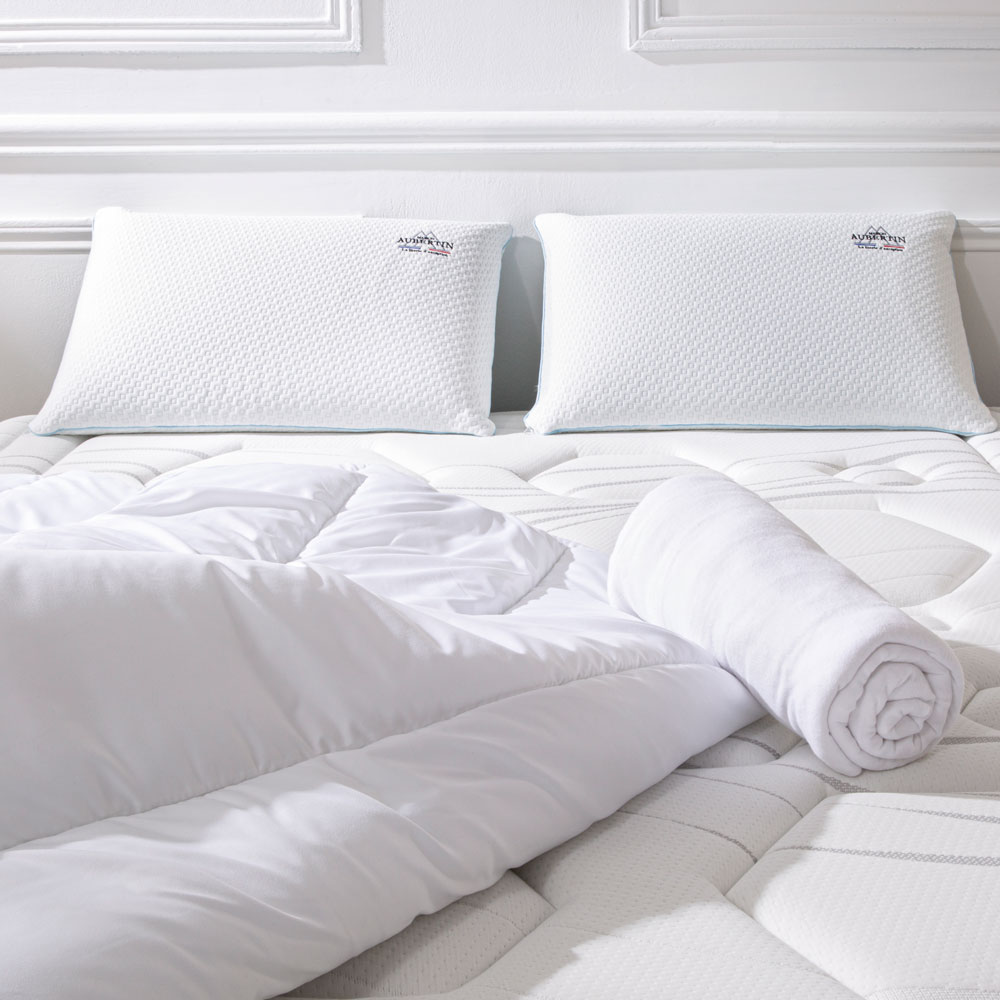 - Protège-matelas (taille adaptée selon la taille de literie choisie) : Ne retient pas l'humidité et la transpiration et protège le matelas des salissures. Il est aussi lavable en machine.