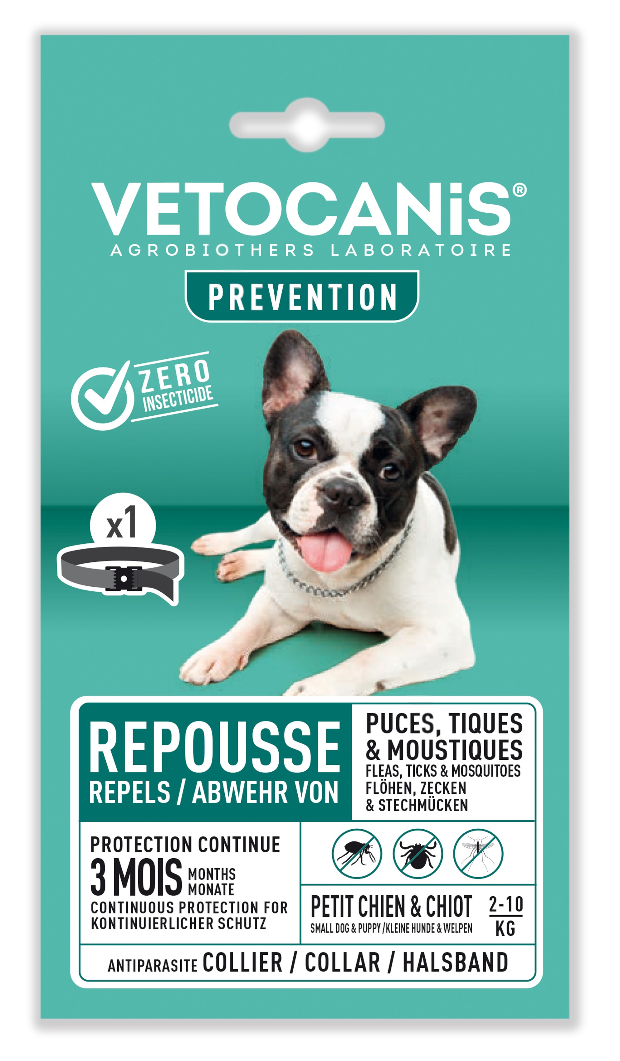 Ce collier anti-puces et anti-tiques vetocanis pour petit chien et chiot de moins de 10 kg permet de repousser les puces, les tiques et les moustiques pendant 3 mois. Ce collier contient des extraits naturels de margosa et de lavandin réputés pour leurs propriétés répulsives. Il dégage une odeur agréable qui n'altère pas l'odorat de votre chien. Longueur du collier : 60 cm.