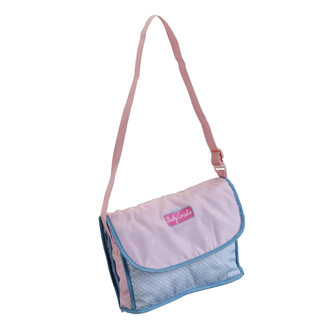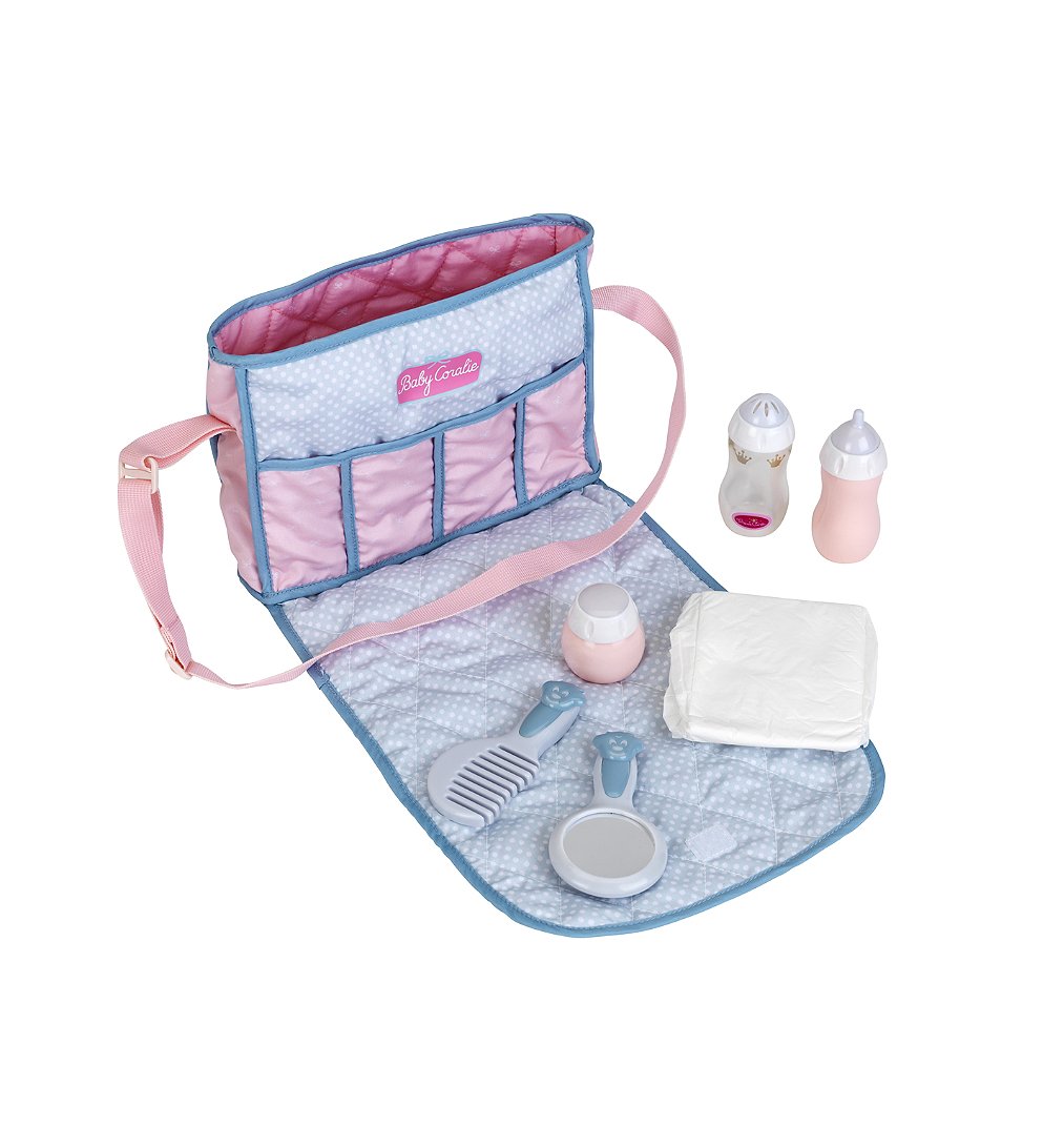 Sac à langer compartimenté en tissu. Équipé d'une bandoulière ajustable idéale pour le transport et d'une partie matelassée pour y allonger confortablement son poupon. Livré avec de nombreux accessoires de puériculture : Peigne, miroir à main, biberon, pot à talc, pot de crème, couche. Dimensions sac ouvert : 34 x 26 x 20 cm.