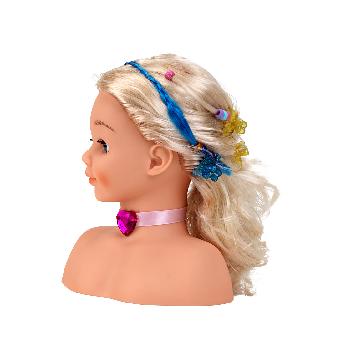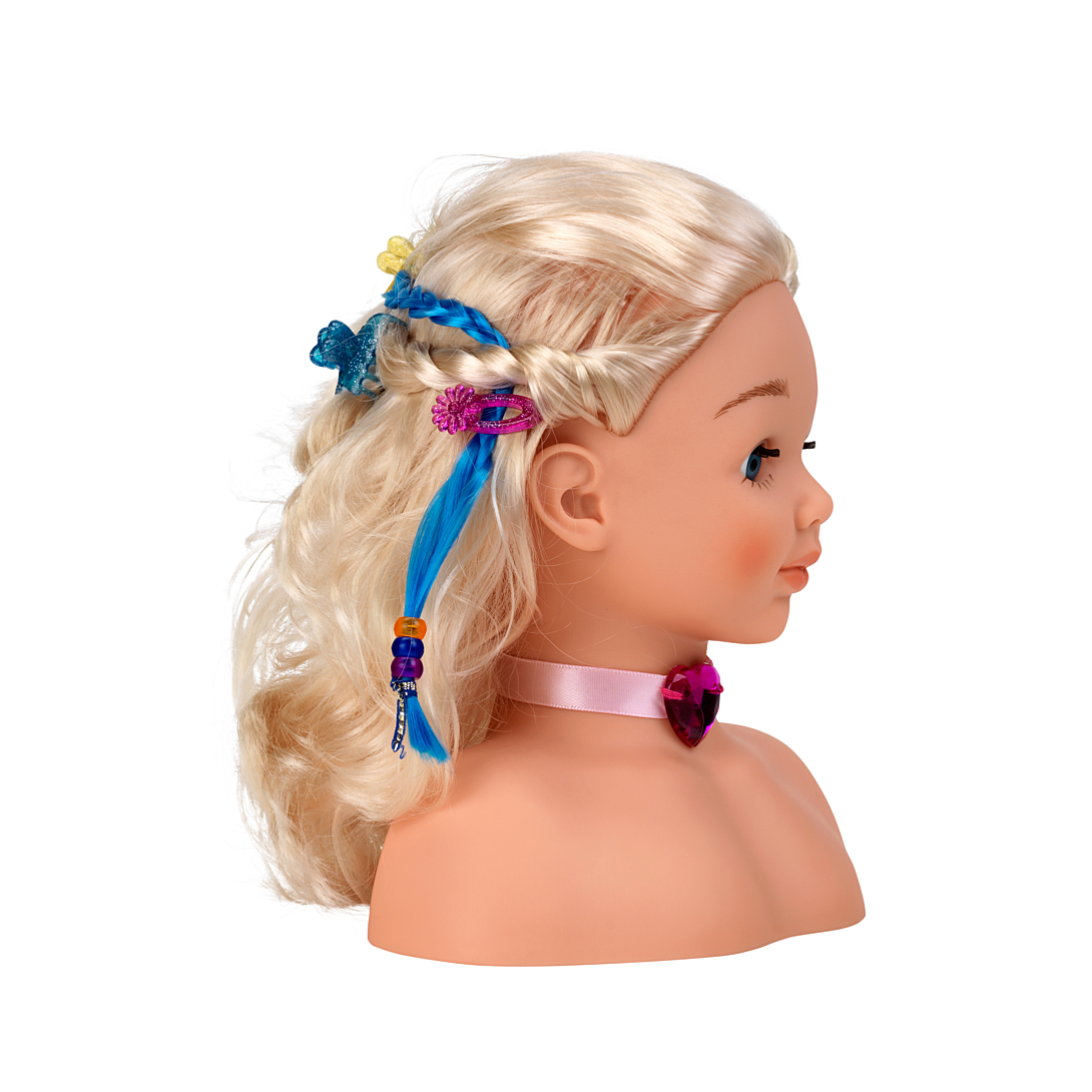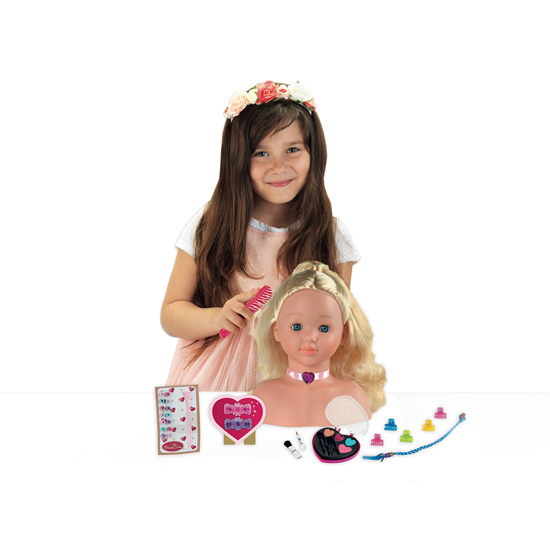 Une tête à coiffer de 25 cm aux traits réalistes, de beaux yeux bleus, de magnifiques cheveux blonds lavables et coiffables. Une palette de vrai maquillage en forme de cœur avec pinceau et applicateur qui peut également être appliqué sur la peau. Brosse à cheveux, pinces et barrettes, mèche de cheveux à clipper, perles à enfiler, collier.... Produit testé et conforme aux normes en vigueur dans le jouet et les cosmétiques.