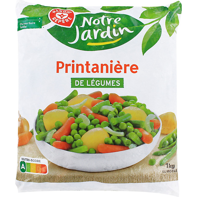 Ingrédients : Petits pois doux 24 % ; pommes de terre entières 24 %, jeunes carottes entières 22 %, haricots verts coupés 20 %, oignons émincés 10 %.