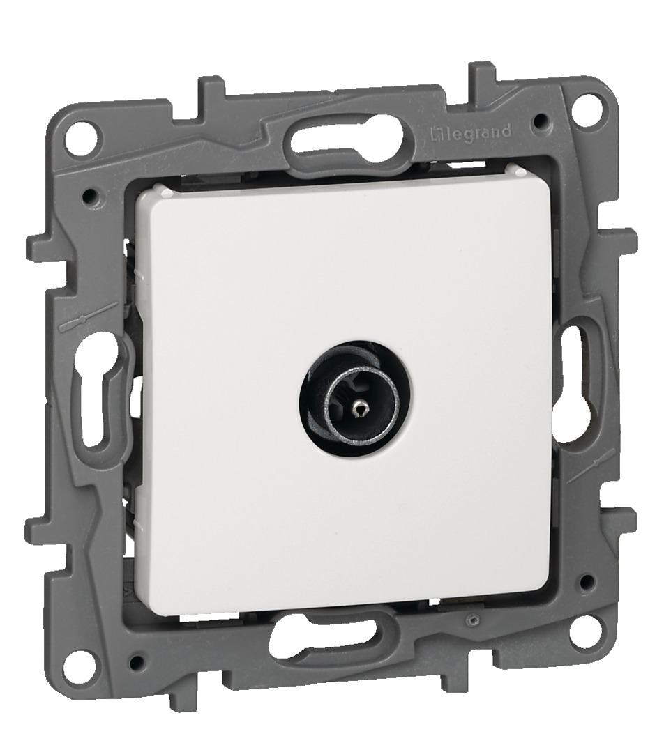 La prise TV NILOÉ de marque Legrand permet à une télévision de recevoir des signaux comme la TNT, réseau câblé et satellite. De plus, elle est dotée d'un blindage étoilé de classe A.