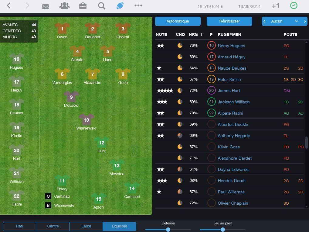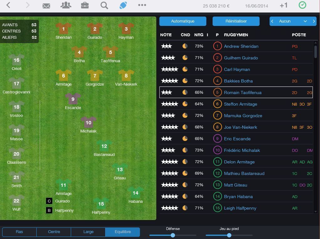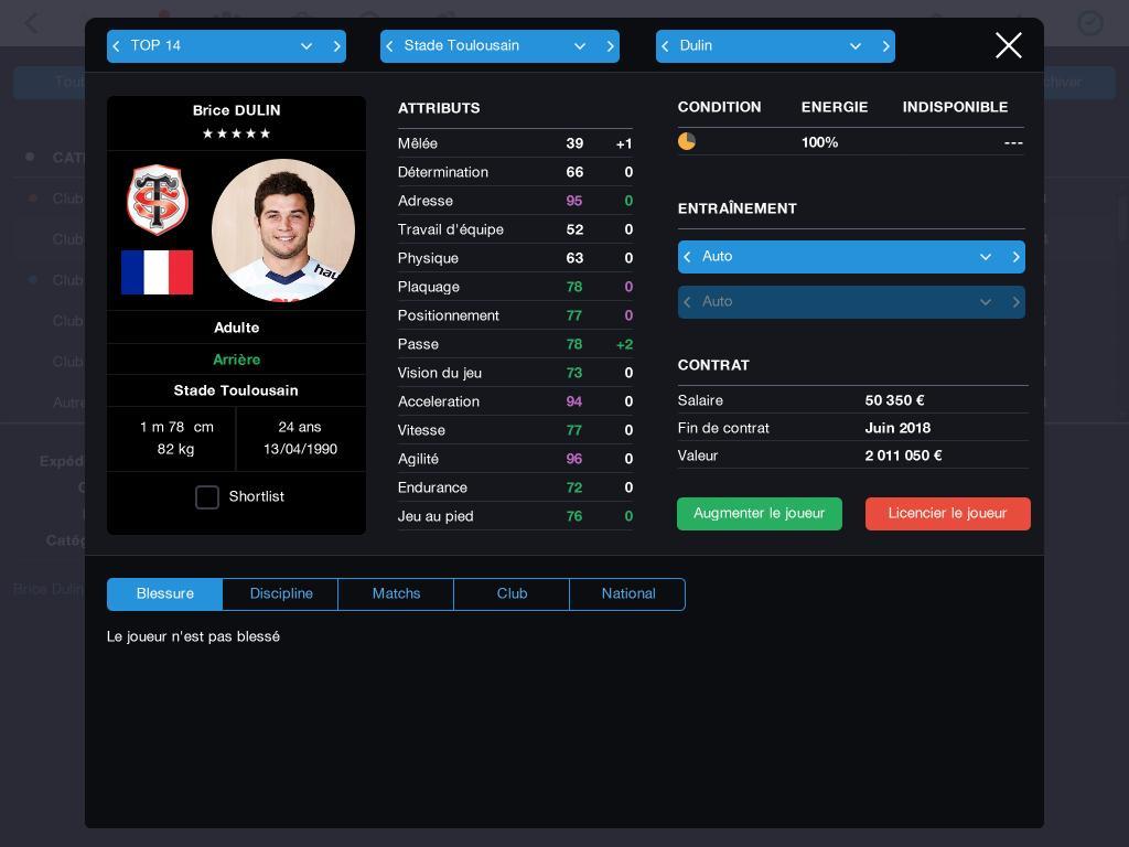Un jeu de management d'équipes de Rugby incluant de nombreuses licenses mais surtout celles du TOP 14 et de la PRO D2. Soyez en charge du Club, des équipes jeunes à l'équipe première, en ayant à gérer les joueurs, corp médical, agents et préparateurs physiques. Les caractéristiques comprennent: - Licences officielles des plus grandes ligues et Championnats - 320 des plus grandes équipes de rugby avec plus de 14 500 joueurs. - Match en 2D et 3D avec une interaction en temps réel avec votre équipe - Contrôler tout le personnel, des entraîneurs assistants, médecins... Vous avez le contrôle à tous les étages du club - Impliquez vous dans toutes les équipes de jeunes de votre club afin de les faire progresser et les intégrer à l'équipe première. - Découvrez des talents cachés entre les équipes de jeunes et travaillez avec les agents et les recruteurs afin de fournir les meilleurs joueurs à votre club.