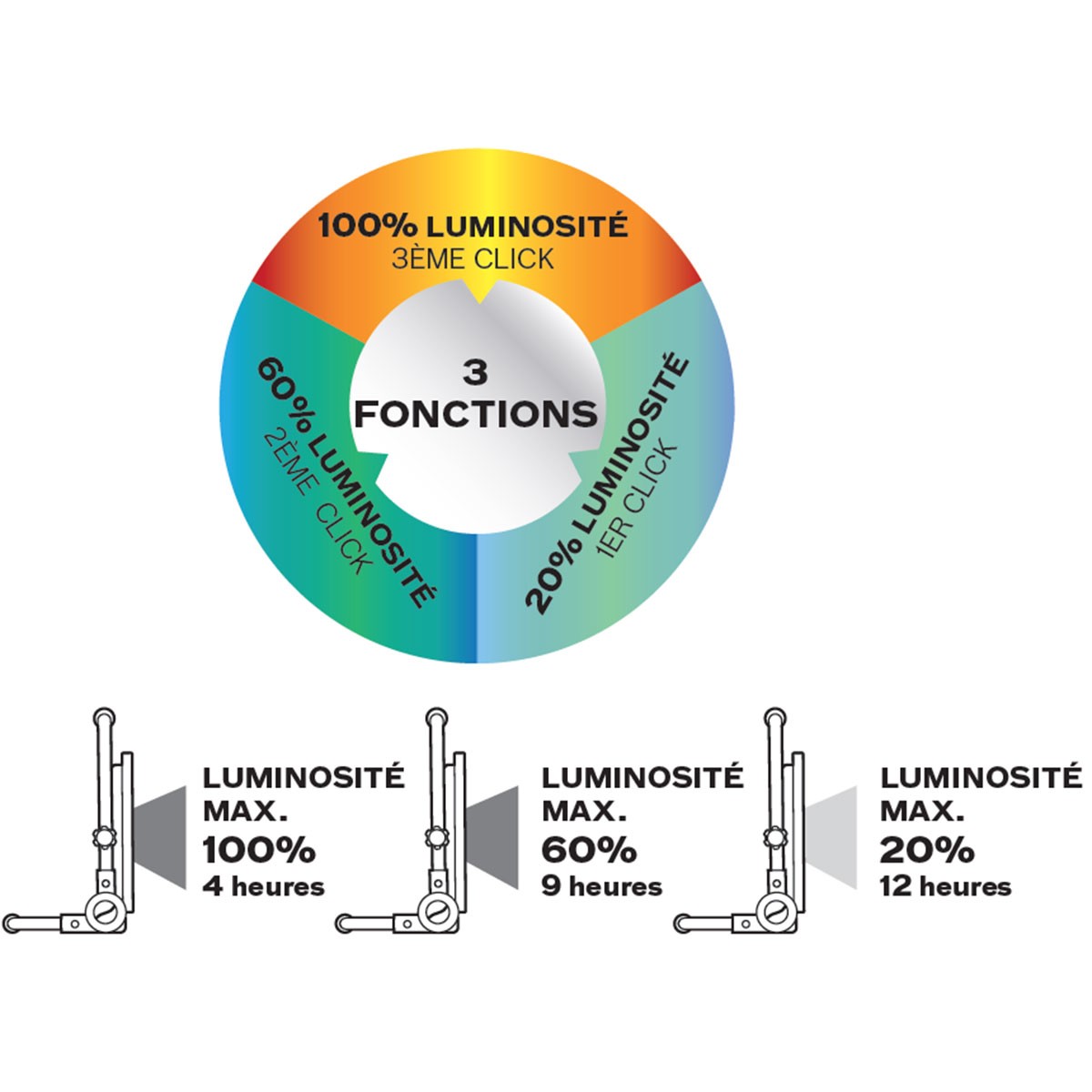 | Plus produit | Autonomie de batterie exceptionnelle entre 4 et 12h selon le mode utilisé. |