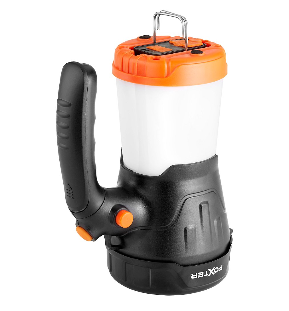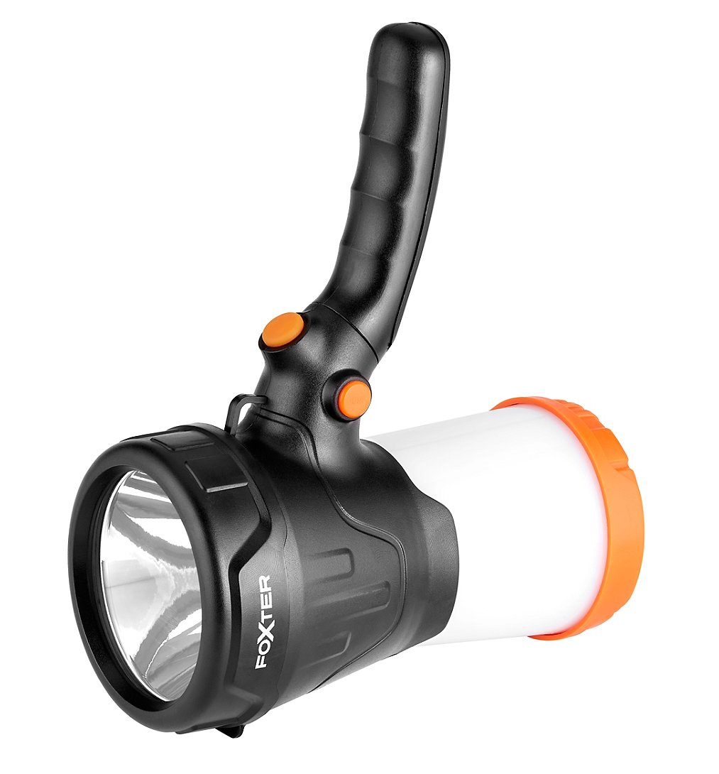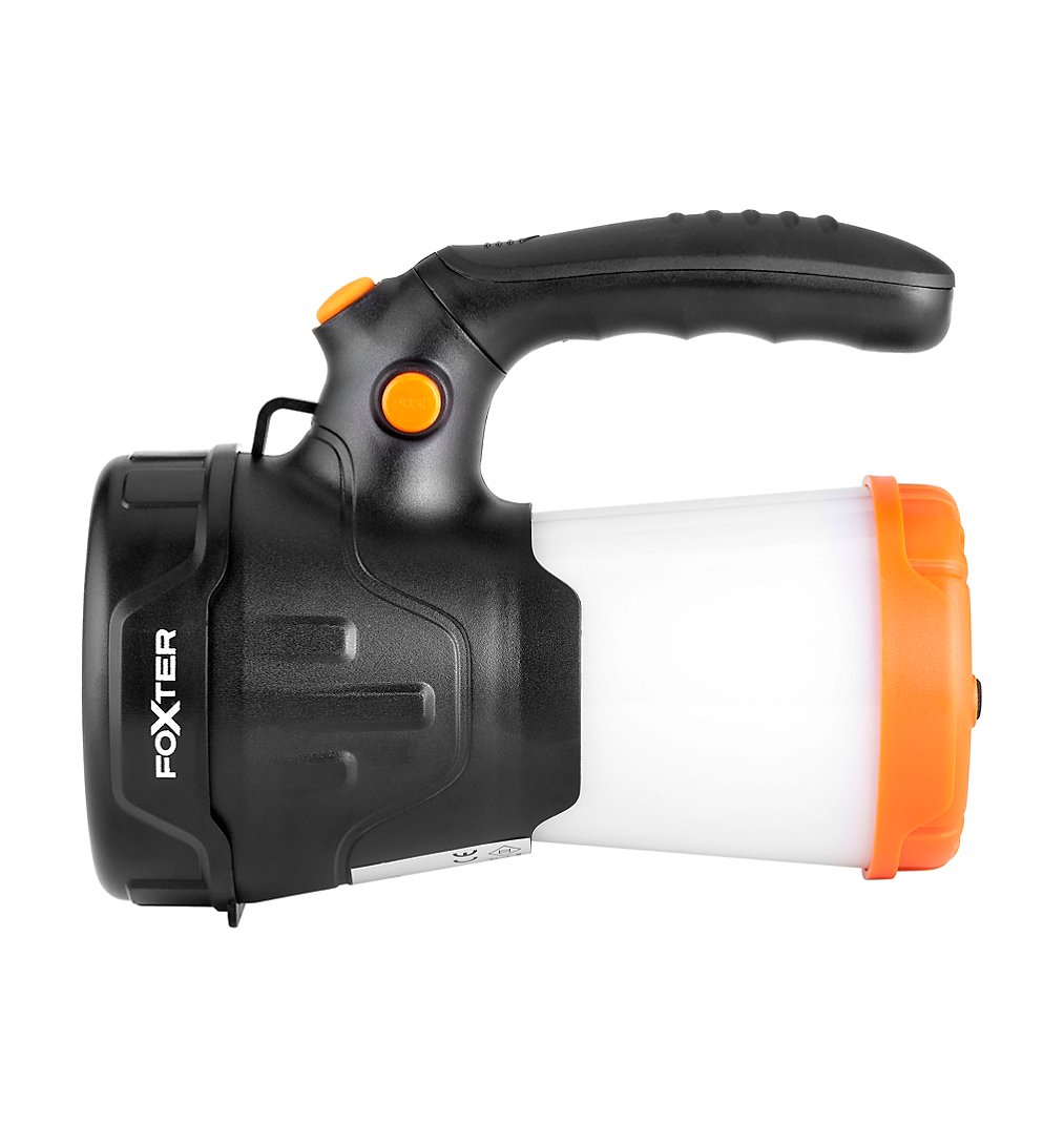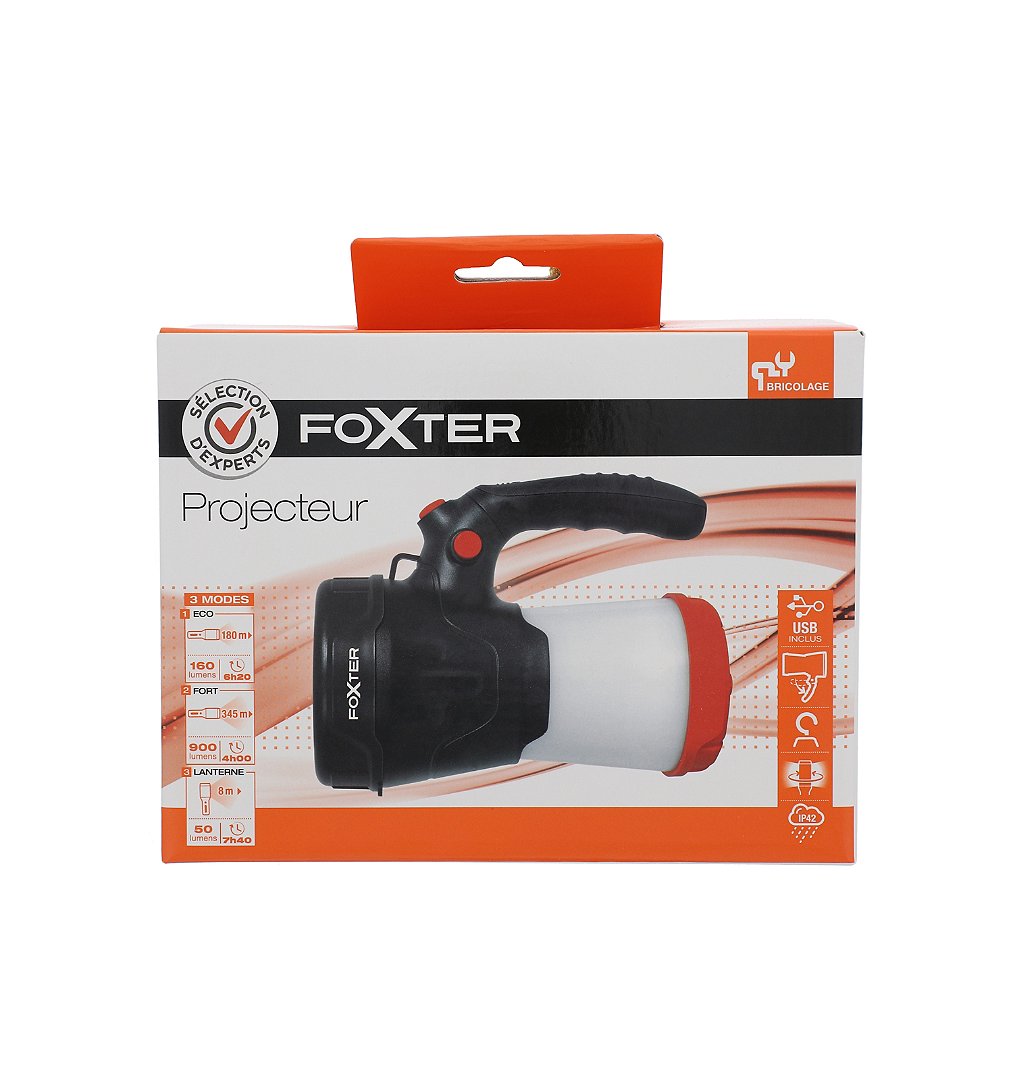 Projecteur - Sélection d'Experts - Foxter - 3 modes d'éclairage : eco, fort, lanterne - Mode eco : Portée de 180m 160 lumens 6h20 de fonctionnement - Mode fort : Portée de 345m 900 lumens 4h de fonctionnement - Mode lanterne : Portée de 8m 50 lumens 7h40 de fonctionnement - Rechargeable via USB (câble USB inclus) - Manche amovible - Accroche pour suspendre la lampe - Tête lumineuse rotative - Protection IP42
