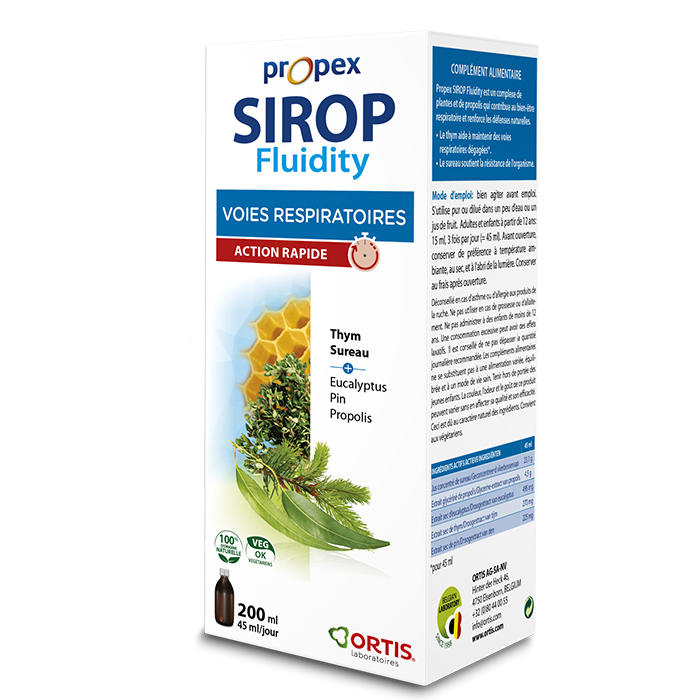 Le Propex SIROP fluidifiant est un complexe de plantes qui contribuent au bien-être respiratoire de toute la famille: • le thym aide à maintenir des voies respiratoires dégagées* • le sureau soutient la résistance de l’organisme Comme tous les compléments alimentaires notifiés, Propex Sirop est sûr à l’usage (dans les conditions d’utilisation mentionnées). Complément alimentaire. Laboratoires ORTIS sprl., 46 Hinter der Heck, B-4750 Elsenborn, BELGIUM
