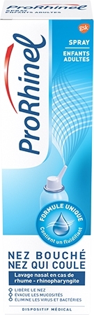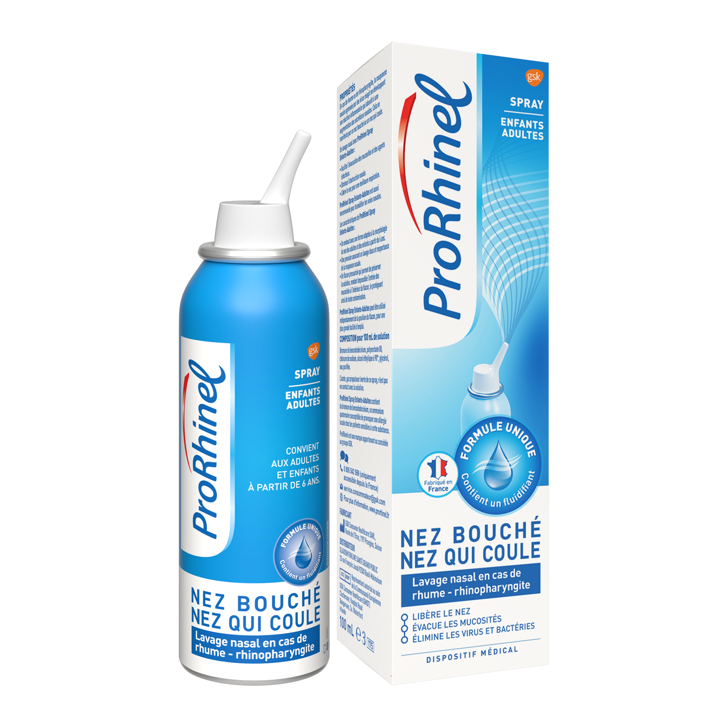 Lavage nasal en cas de rhume et de rhinopharyngite. En cas de rhume, se laver le nez avec ProRhinel Spray enfants-adultes facilite l’élimination des mucosités et des agents infectieux et diminue l’obstruction nasale. FORMULE UNIQUE, CONTIENT UN FLUIDIFIANT.