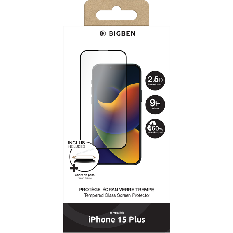 | Libellé | Protège écran verre trempé 2.5D iPhone 15 Plus dureté 9H, 60% verre recyclé Cerifié GRS + Cadre de pose Bigben |