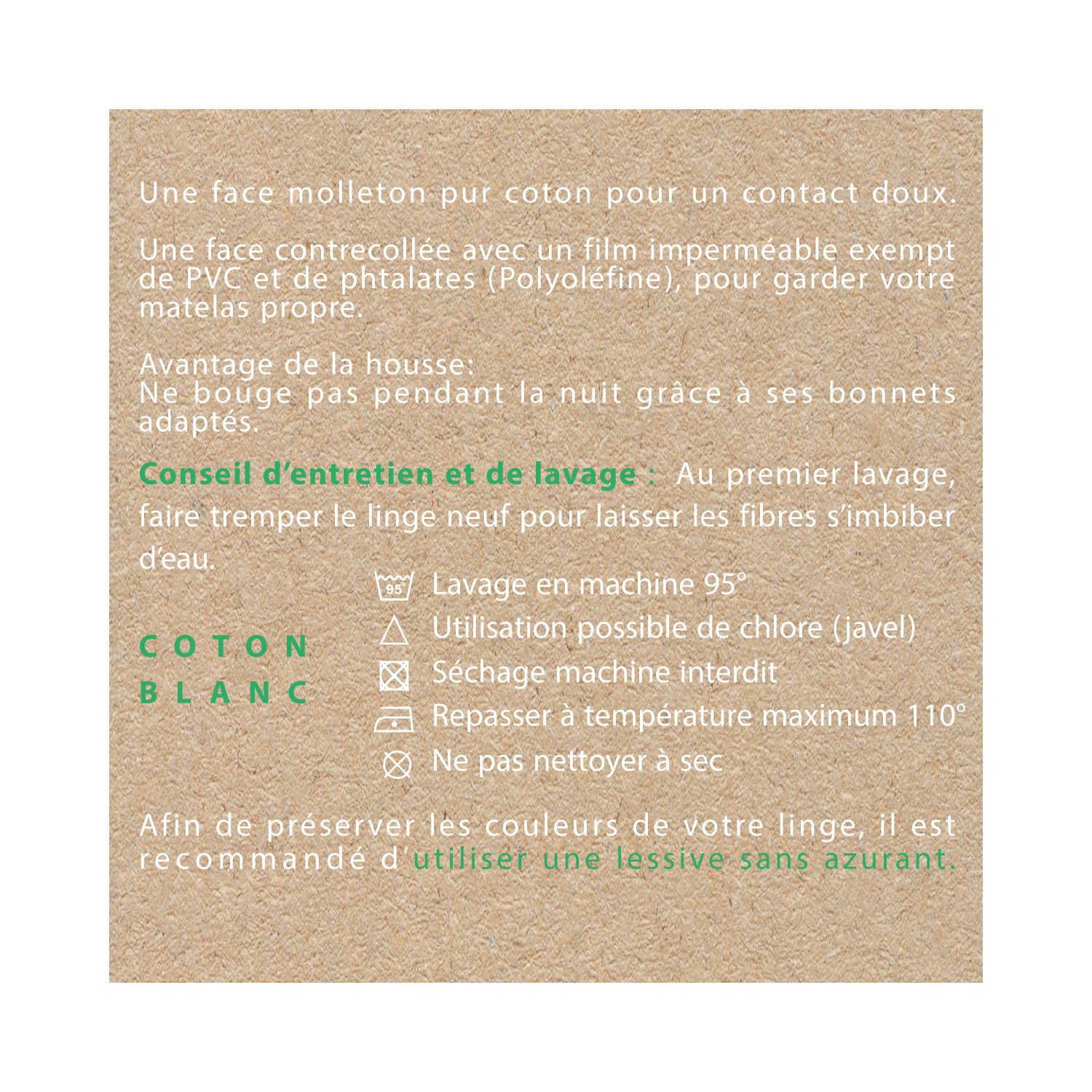 Composition : 1 face confortable : Molleton 100% coton et 1 face imperméable contrecollée : Film Polyoléfine (ne contient pas de phtalates)