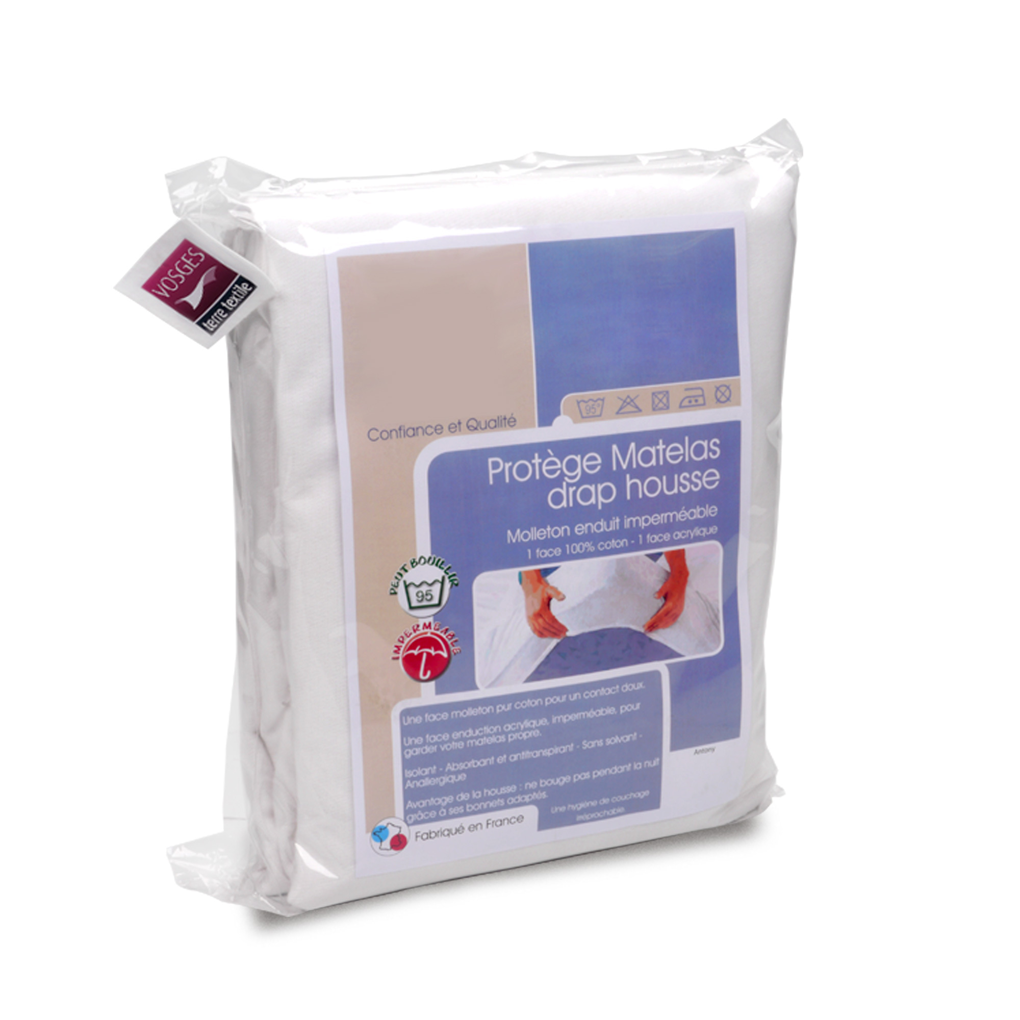 | Plus produit | Alèse imperméable 70x190 cm, forme drap housse, molleton 280 g/m2 enduit acrylique - Anallergique & anti-bactérien - Hypoallergénique - Grand bonnet 30cm pour matelas épais jusqu'à 27cm d'épaisseur - Lavage à 60°C - Fabriqué en France |