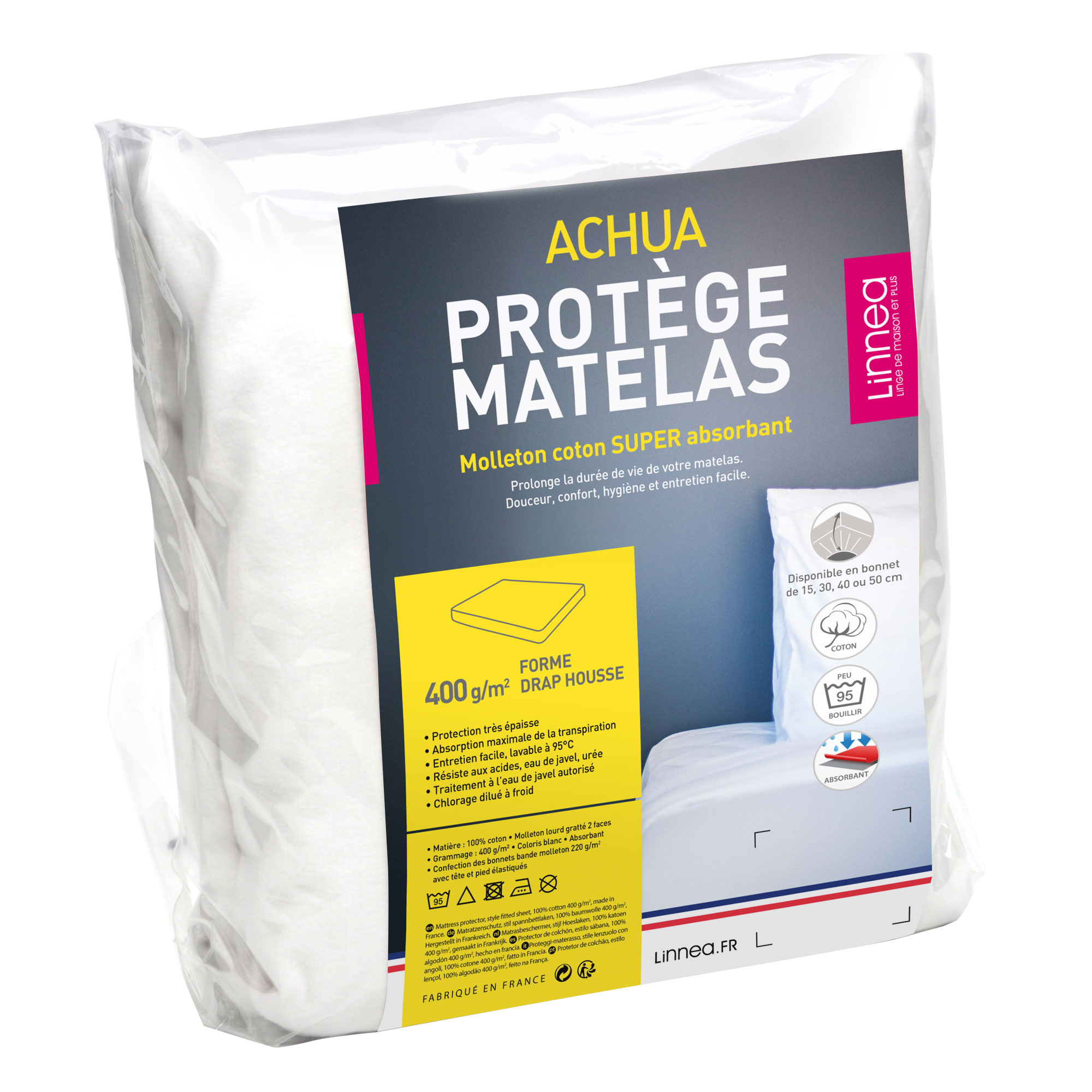 Plus produit Protection literie 70x190 cm ACHUA, molleton épais 100% coton 400 g/m2 super absorbant. Forme drap housse, bonnet de 30cm pour matelas jusqu'à 25cm d'épaisseur - Entretien facile, lavage à 95°C - Fabriqué en France