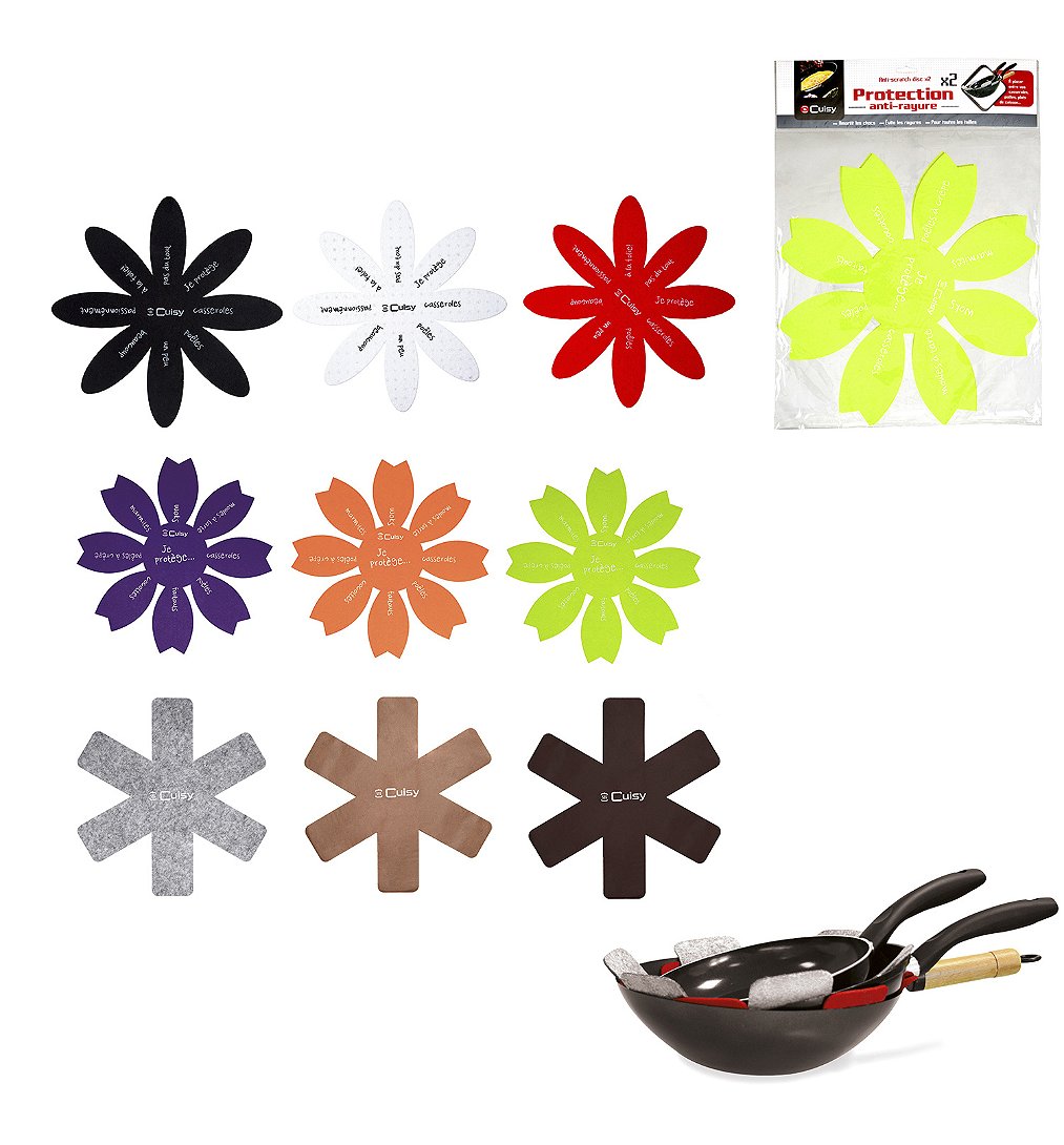 Positionnez cette protection anti-rayure entre vos poêles et casseroles pour amortir les chocs et éviter les rayures au moment du rangement. Cet accessoire vous permettra de superposer autant que vous le voudrez! Détail : Lot de 2 - Diamètre : 38 cm - Composition : feutrine - Design illustré de messages.