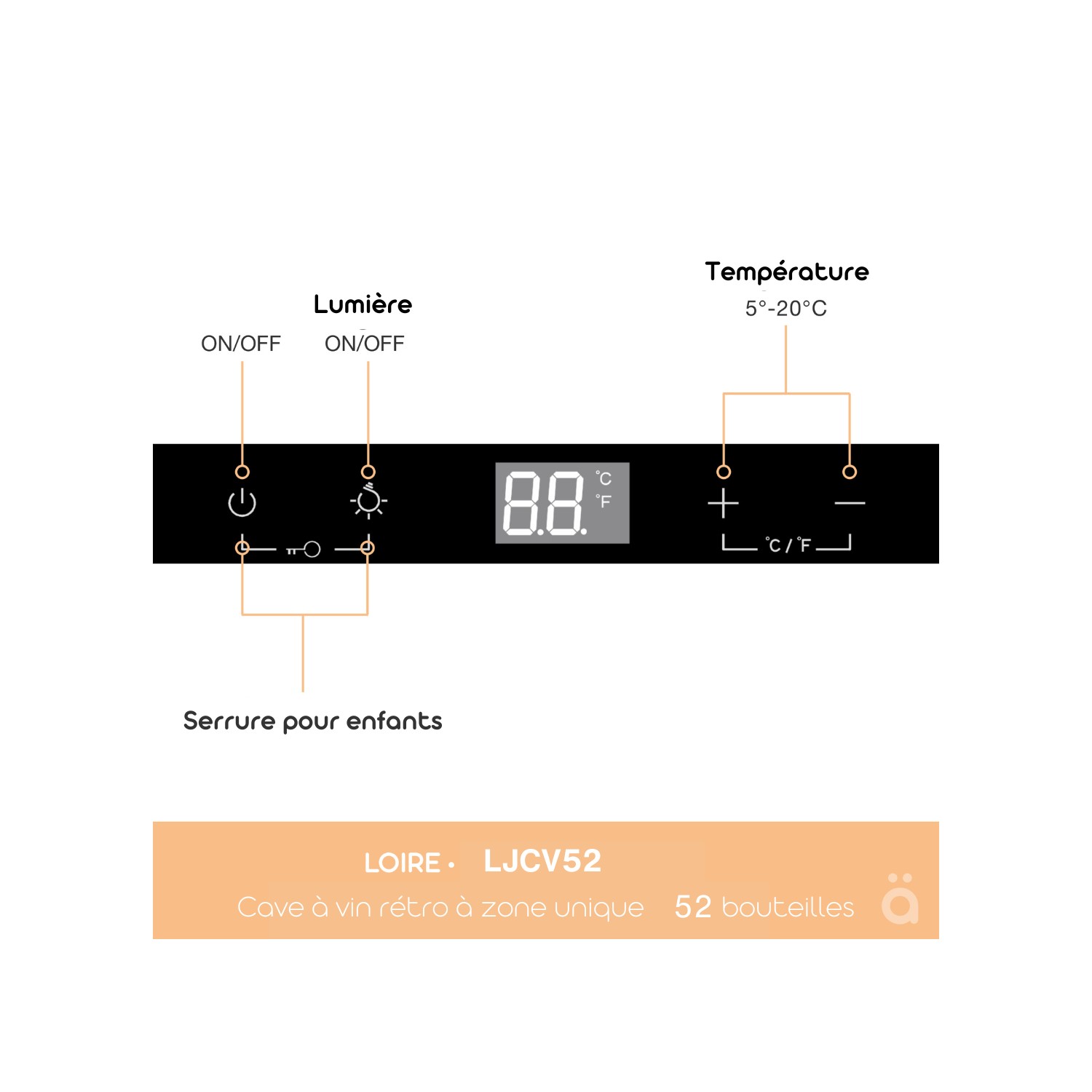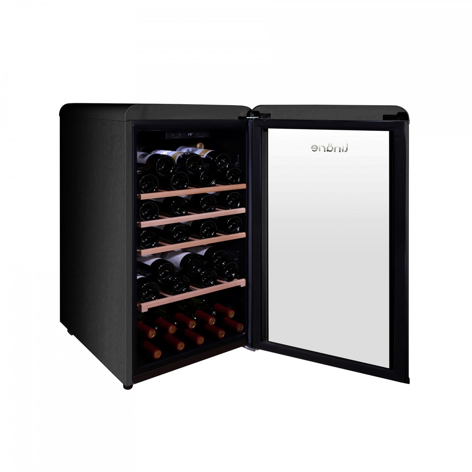 Cette cave de service LJCV52BLACK design vintage avec une finition lisse et brillante et des détails de garniture argentés qui ajoutent une touche d'élégance pour s'adapter à n'importe quel design ou concept de cuisine. Idéale dans un bureau, séjour, sous escalier, cuisine, chambre. Solide charnière installée d'origine à droite (porte non réversible). L'air brassé permet de réduire les écarts naturels de température entre le haut et le bas de la cave (mono température). Le réglage électronique permet de choisir la température au degré près entre 5°C et 20°C